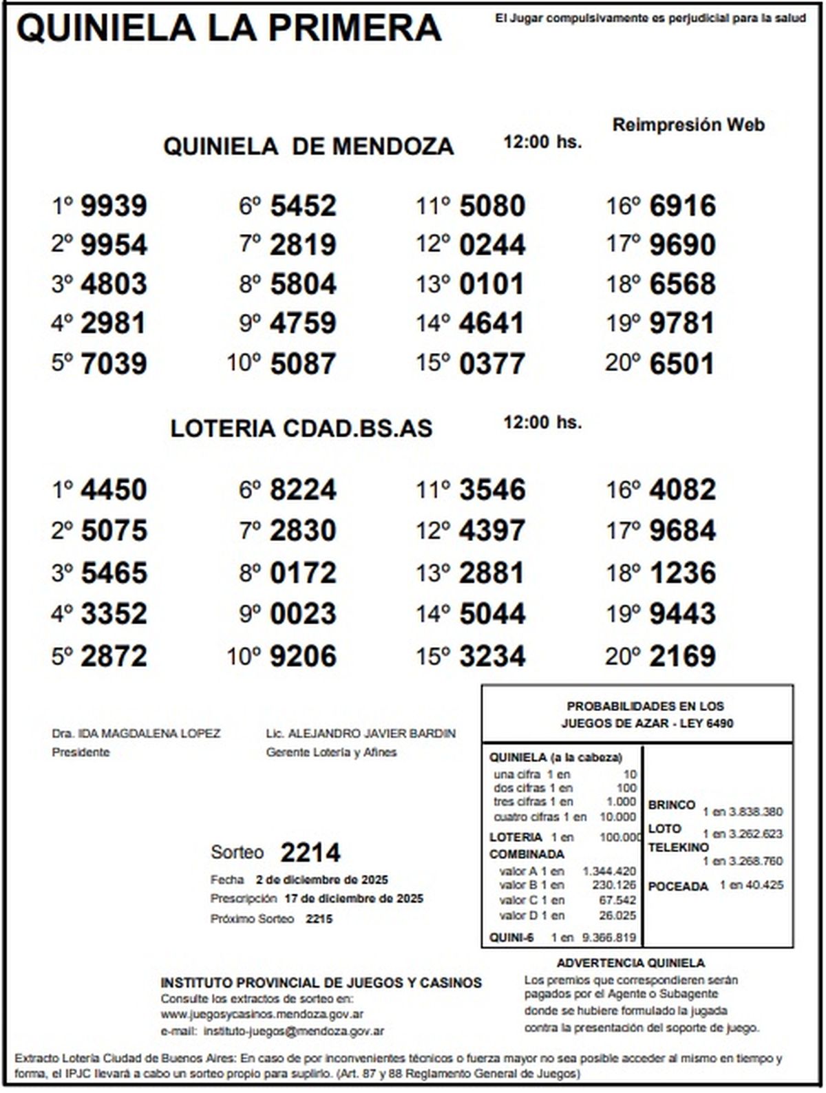 Resultados Quiniela de Mendoza: La Primera del 2 de diciembre de 2025