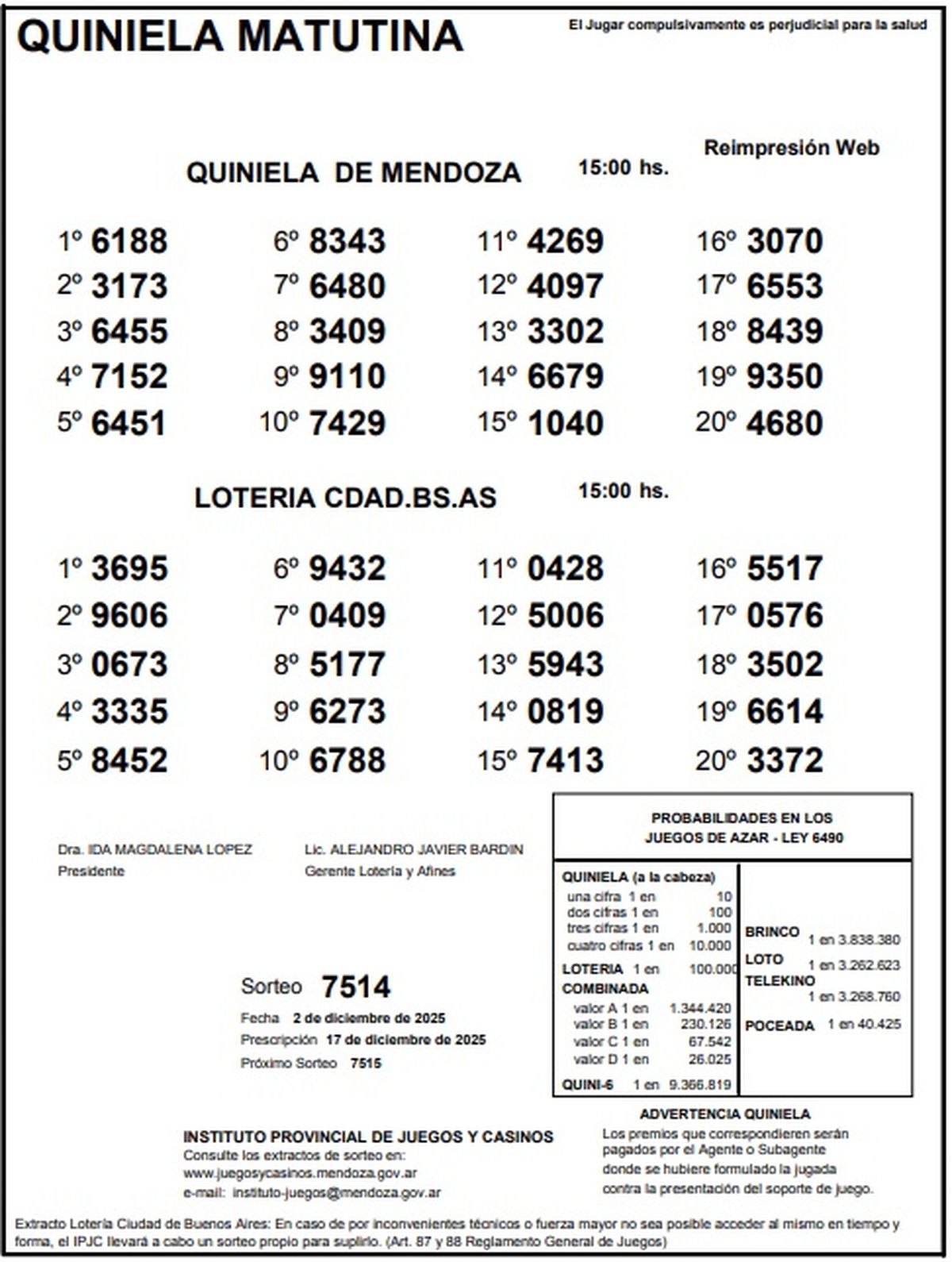 Resultados Quiniela de Mendoza: La Matutina del 2 de diciembre de 2025