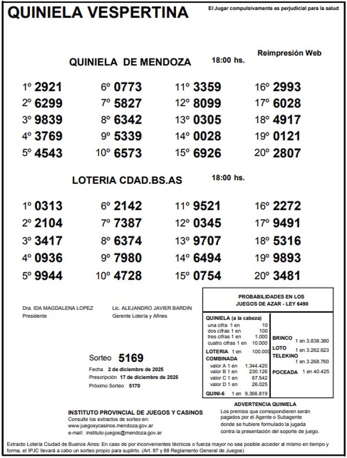 Resultados Quiniela de Mendoza: La Vespertina del 2 de diciembre de 2025