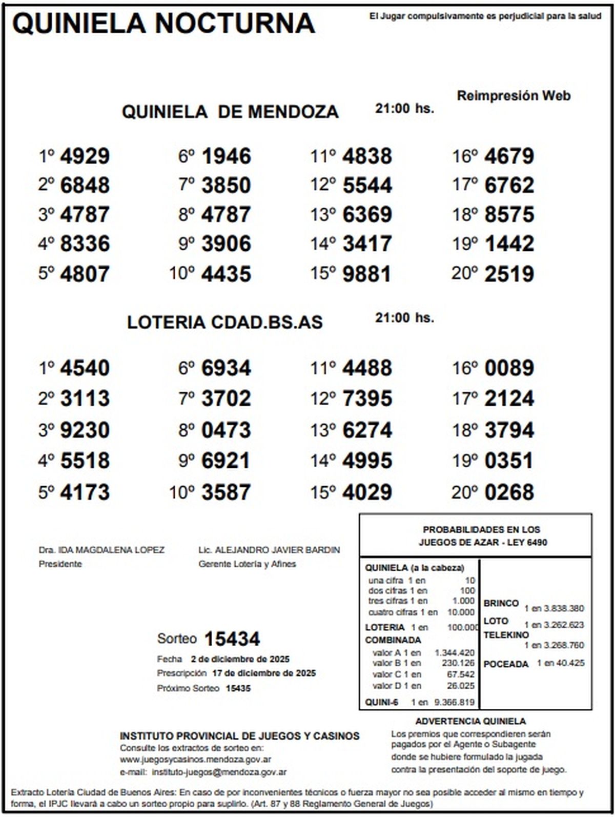 Quiniela de Mendoza: resultados de la Nocturna de hoy, 2 de diciembre de 2025