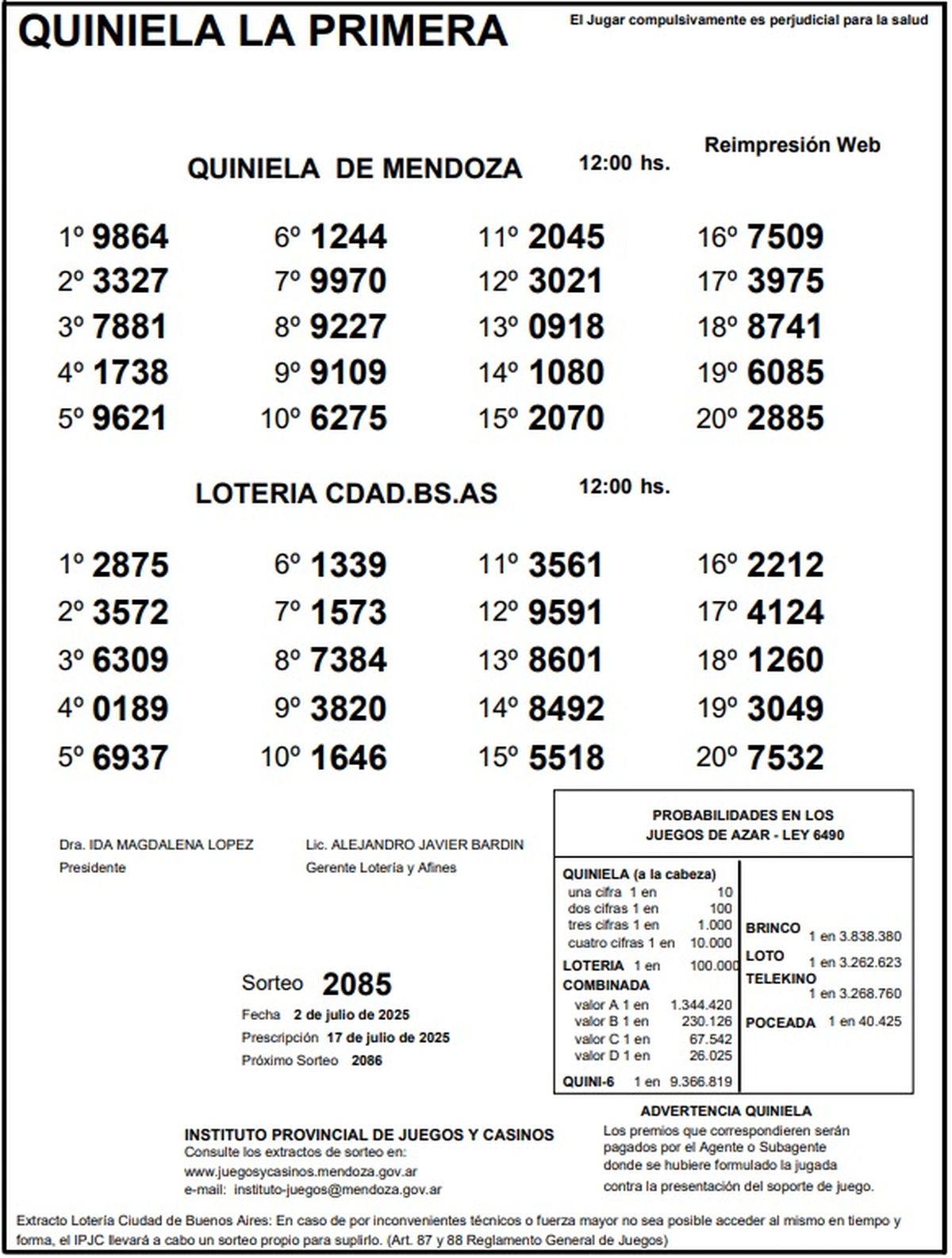Resultados Quiniela de Mendoza: La Primera del 2 de julio de 2025