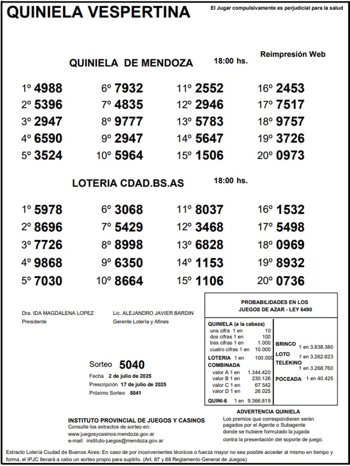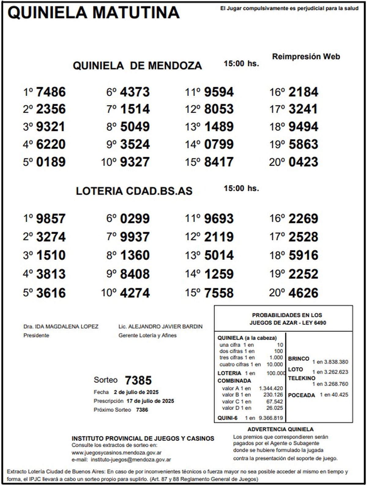 Resultados Quiniela de Mendoza: La Matutina del 2 de julio de 2025