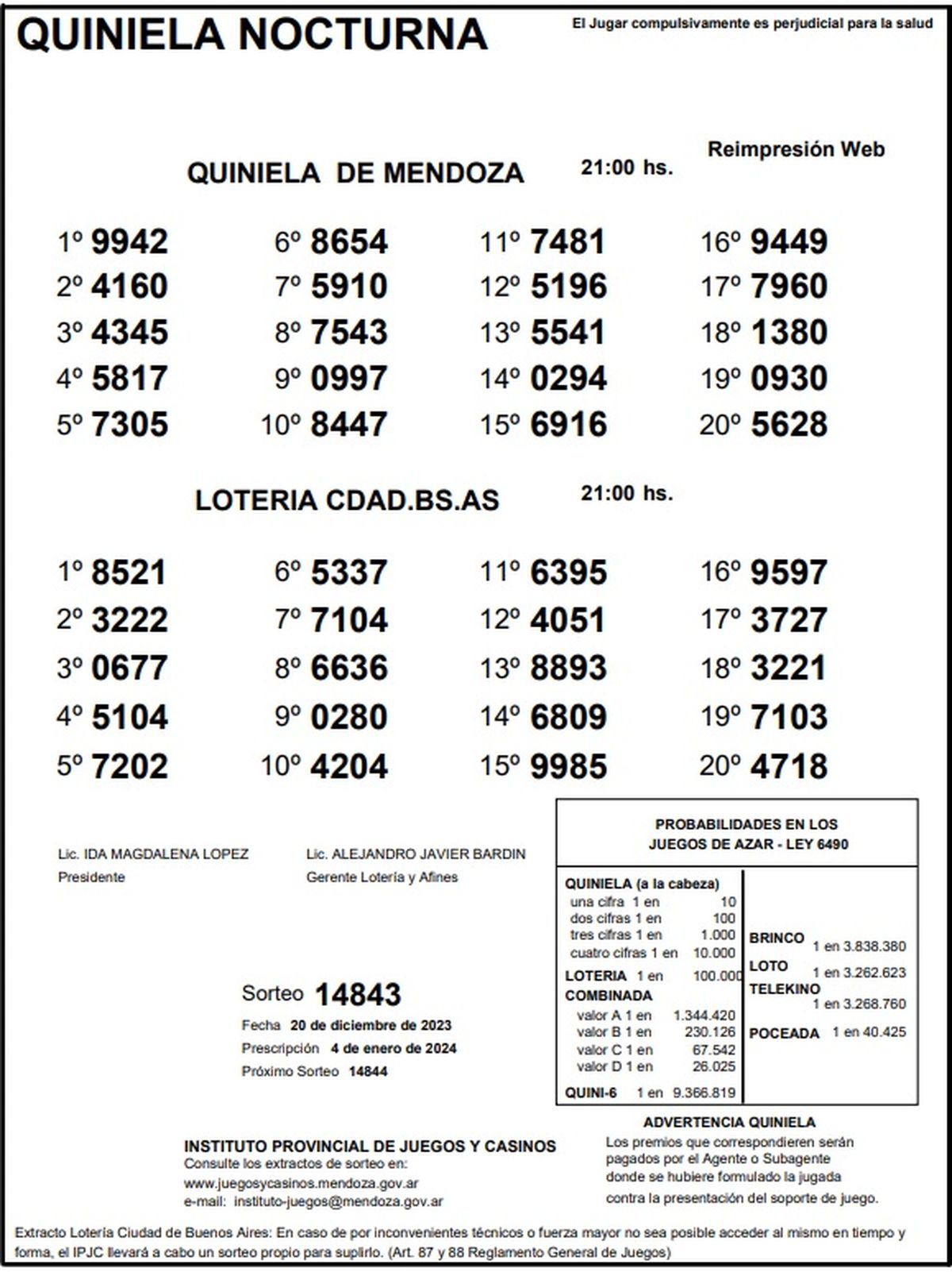Quiniela de Mendoza: resultados de la Nocturna de hoy, 20 de diciembre de 2023