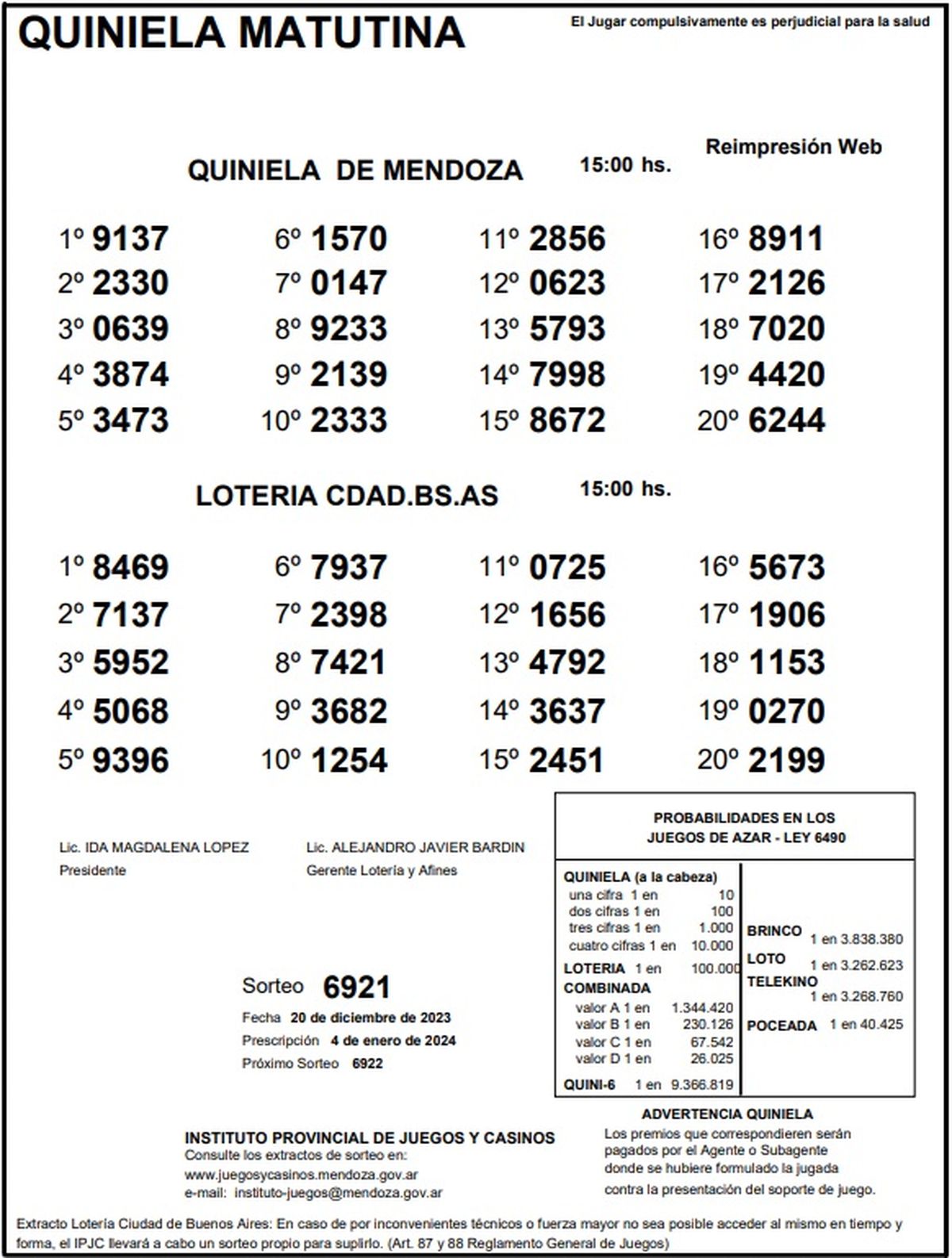 Resultados Quiniela de Mendoza: La Matutina del 20 de diciembre 2023