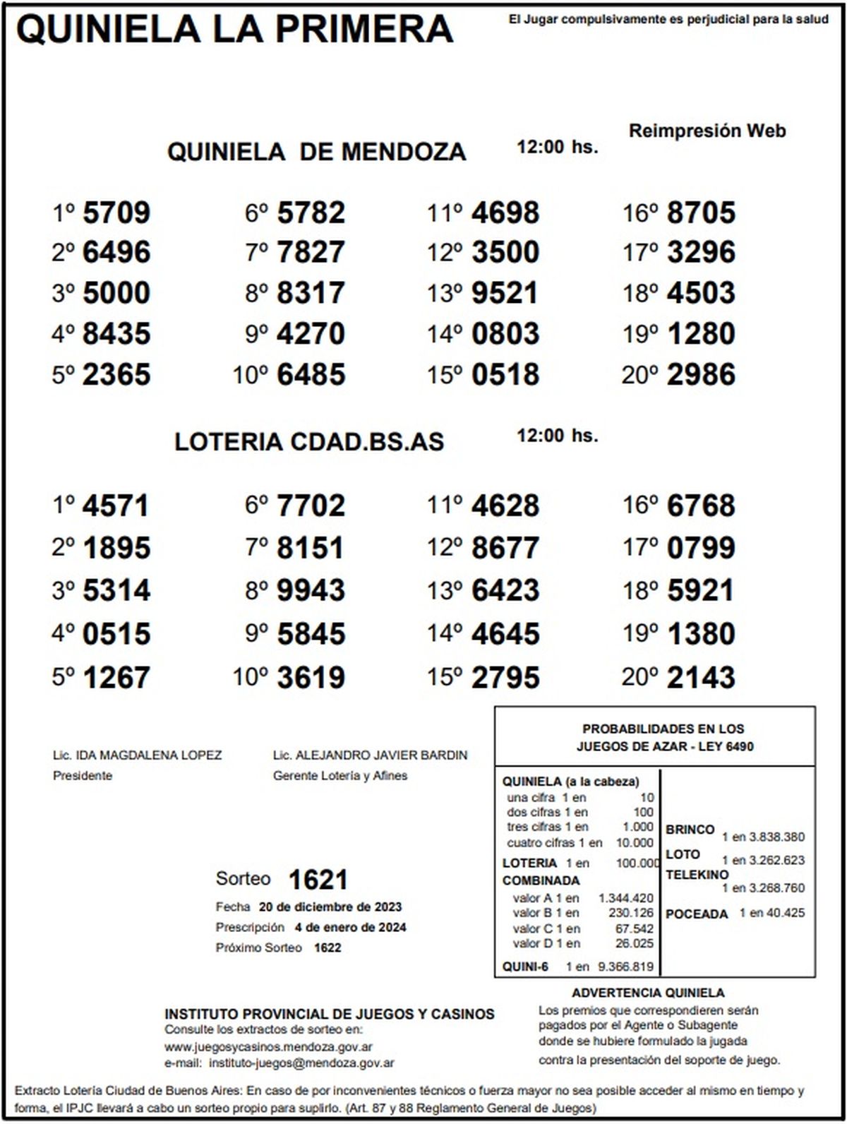 Resultados Quiniela de Mendoza: La Primera del 20 de diciembre 2023