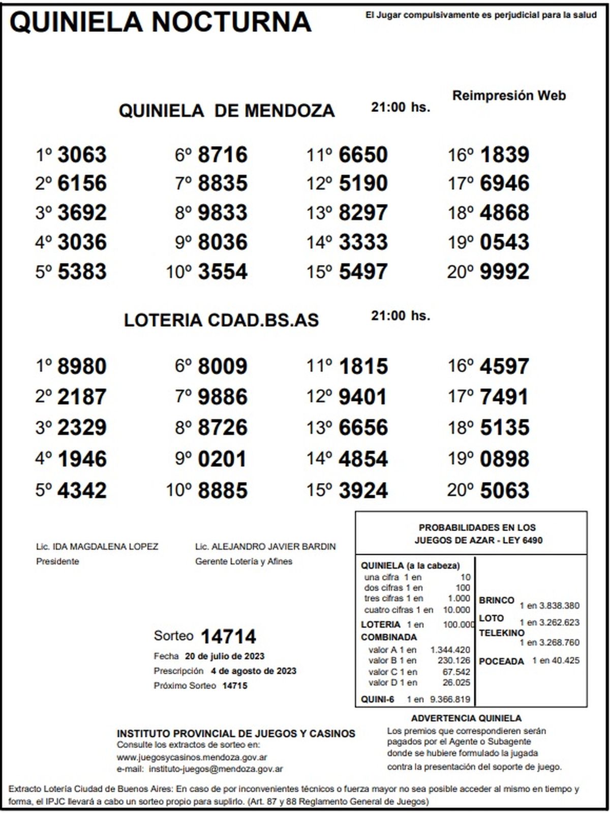 Quiniela de Mendoza: resultados de la Nocturna de hoy, 20 de julio de 2023