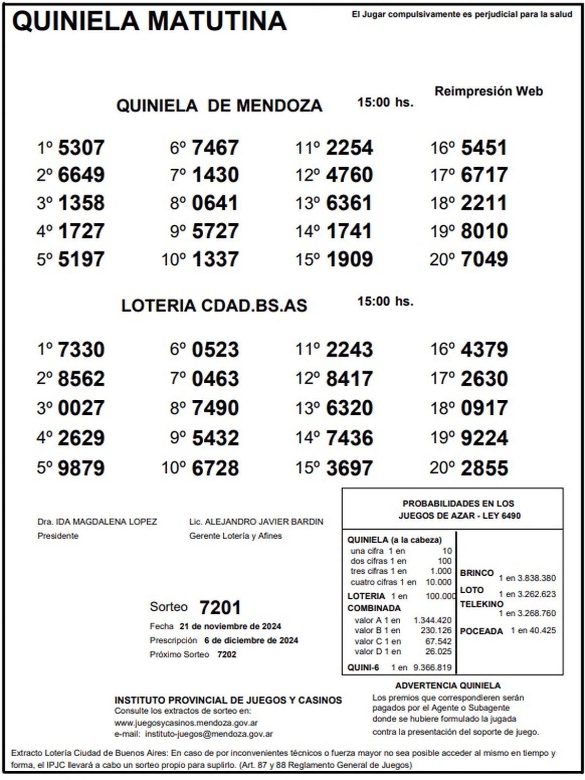 Resultados Quiniela de Mendoza: La Matutina del 21 de noviembre de 2024
