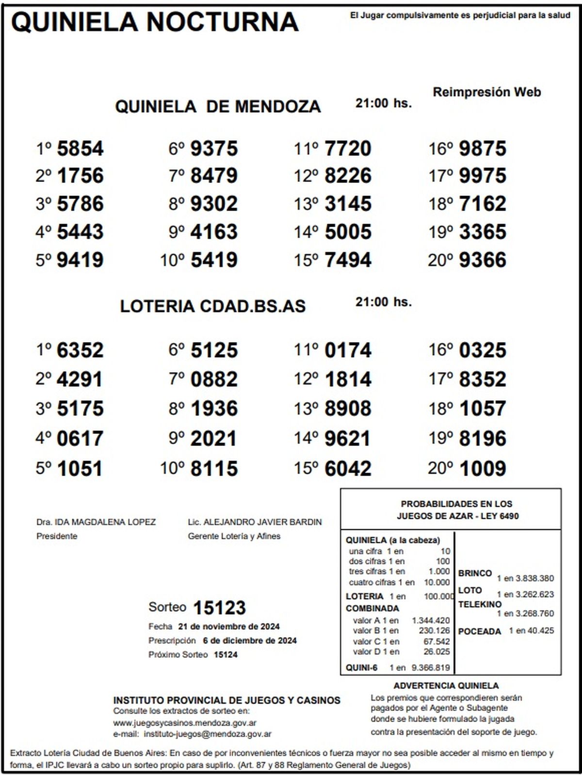 Quiniela de Mendoza: resultados de la Nocturna de hoy, 21 de noviembre de 2024