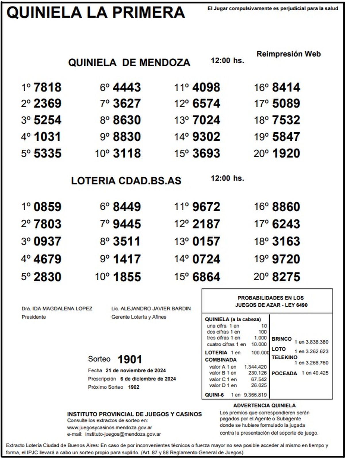 Resultados Quiniela de Mendoza: La Primera del 21 de noviembre de 2024
