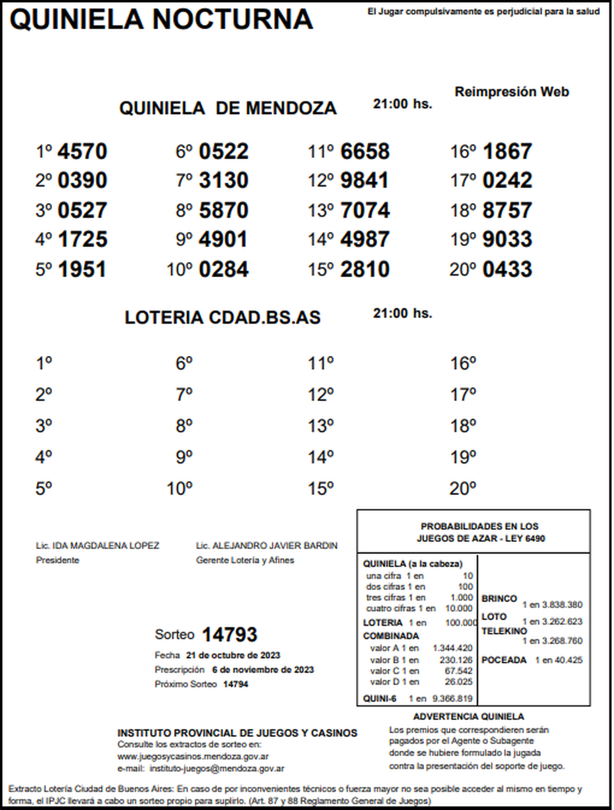 Quiniela de Mendoza: resultados de la Nocturna de hoy, 21 de octubre de 2023