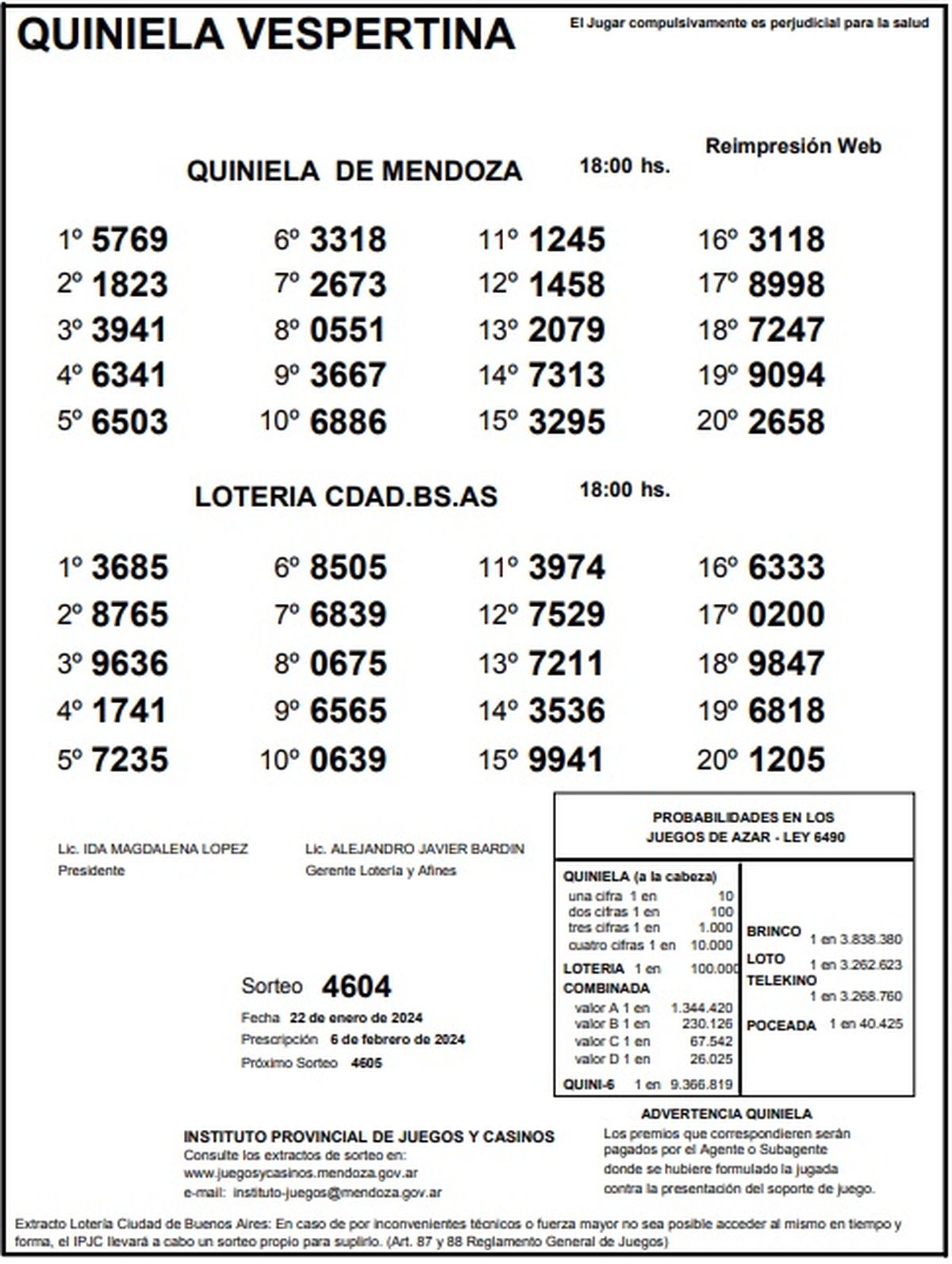 Resultados Quiniela de Mendoza: La Vespertina del 22 de enero 2024