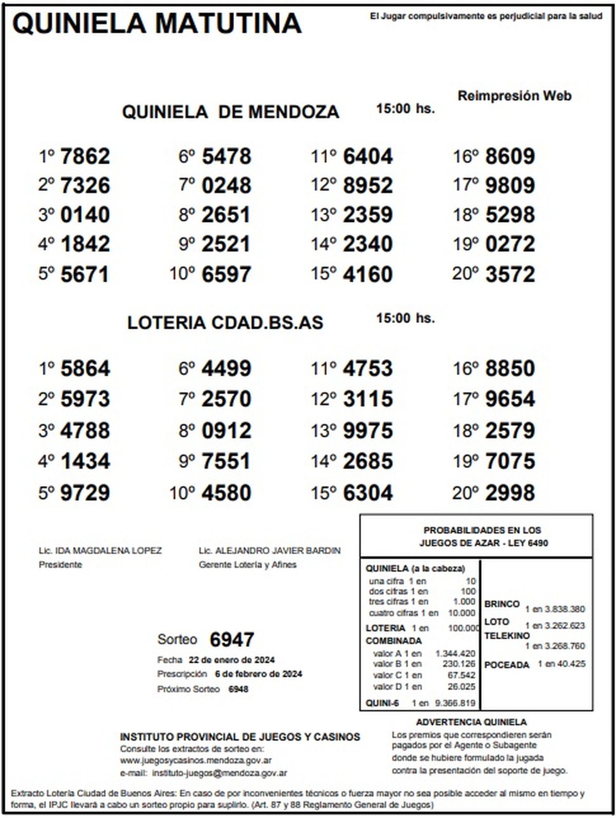 Resultados Quiniela de Mendoza: La Matutina del 22 de enero 2024
