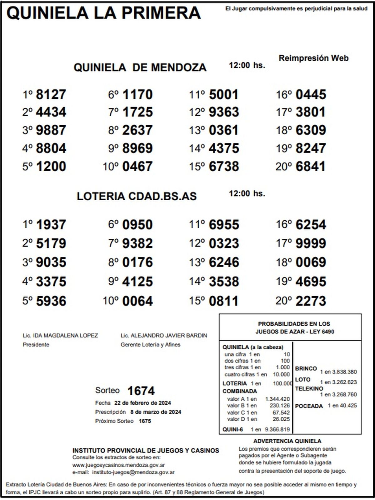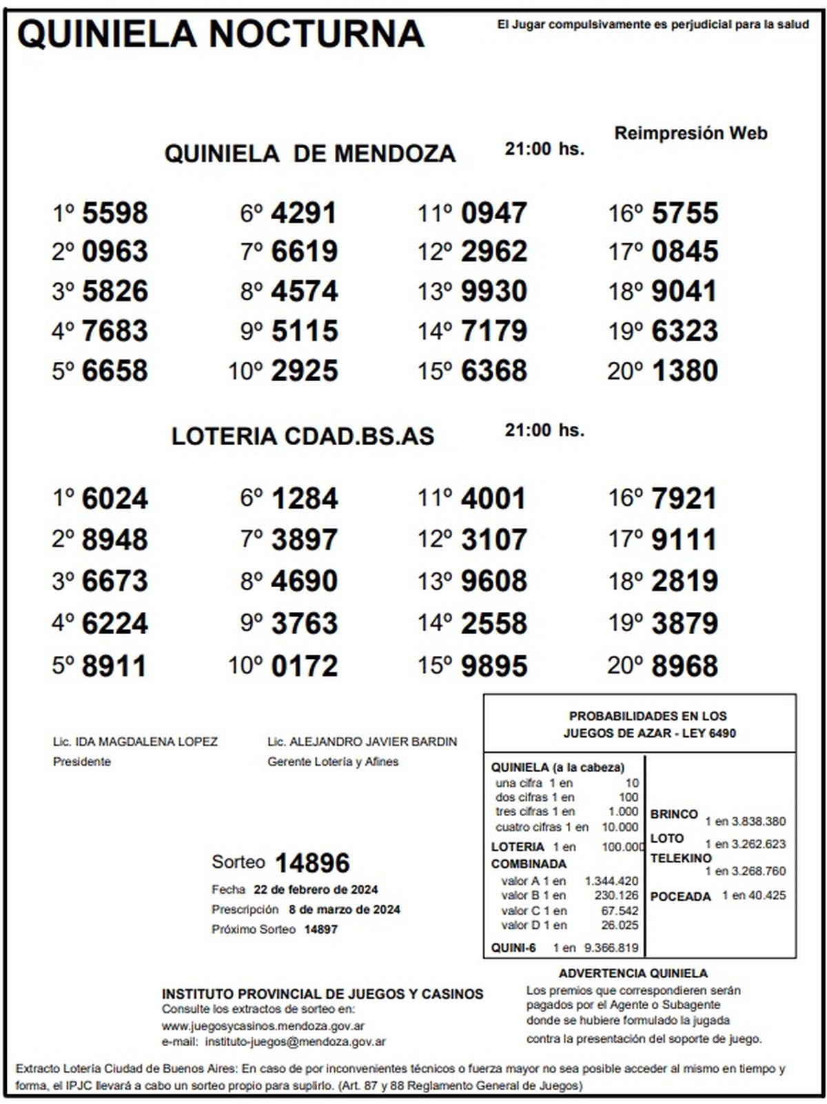 Quiniela de Mendoza: resultados de la Nocturna de hoy, 22 de febrero de 2024
