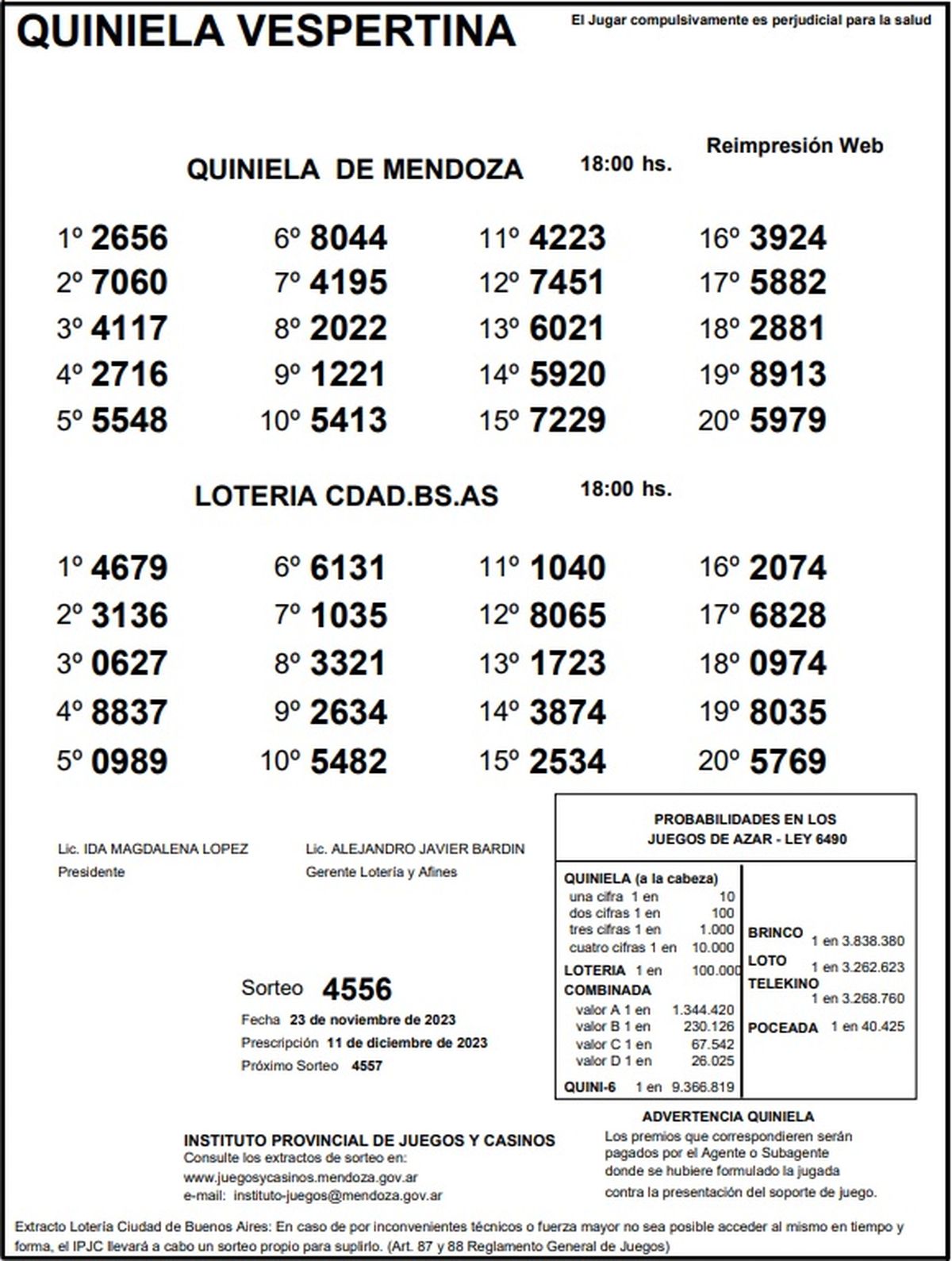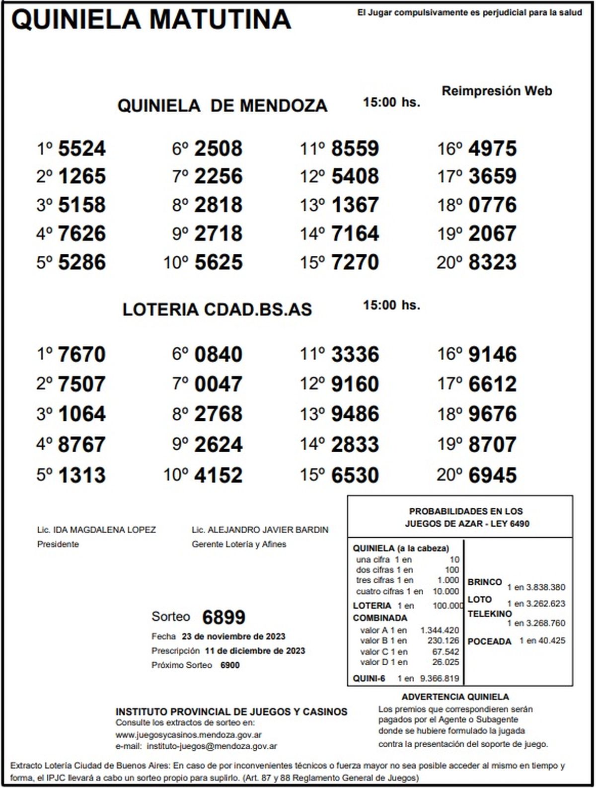 Quiniela de Mendoza: resultados de la Nocturna de hoy, 23 de noviembre de 2023