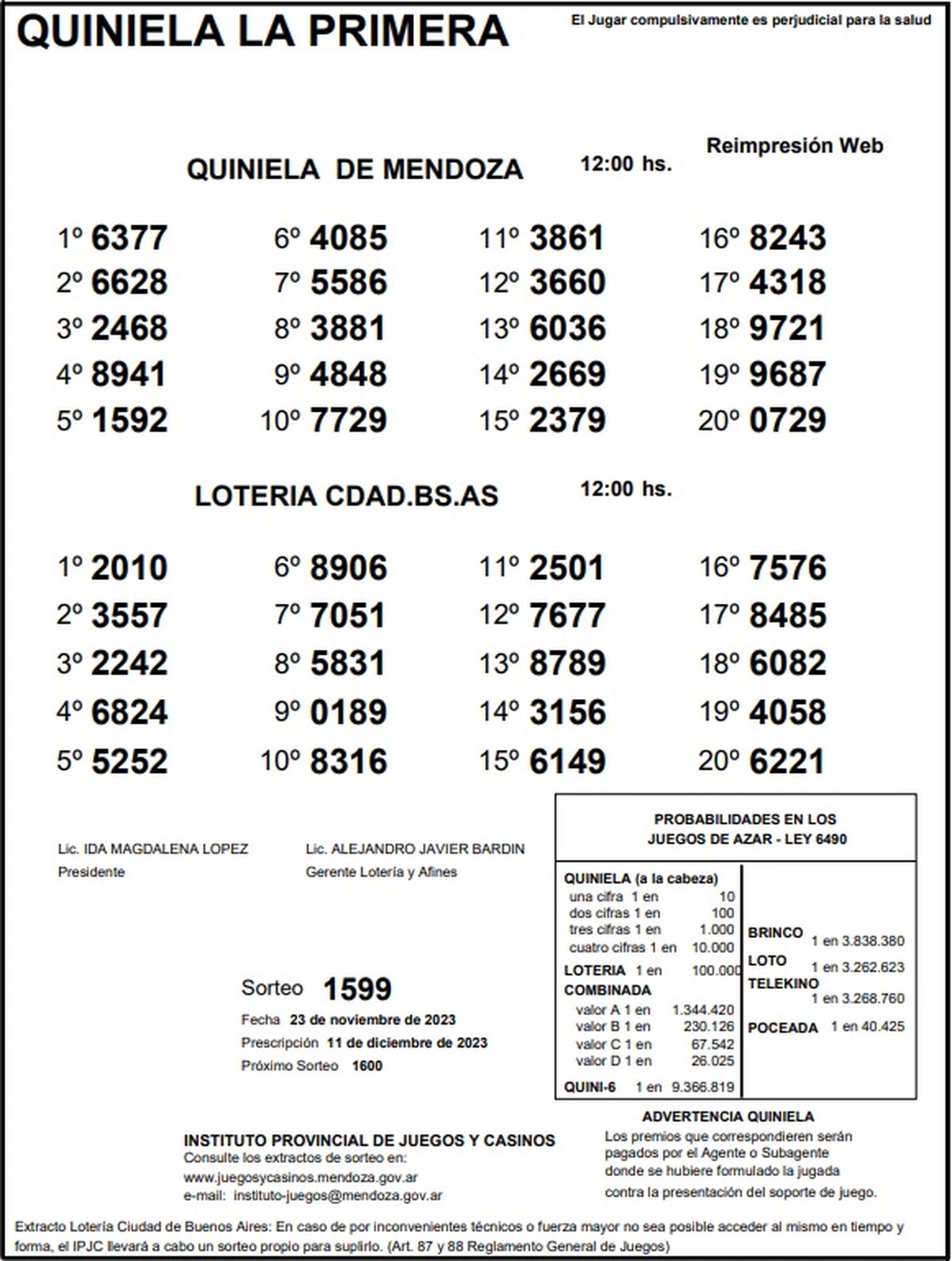 Resultados Quiniela de Mendoza: La Primera del 23 de noviembre 2023