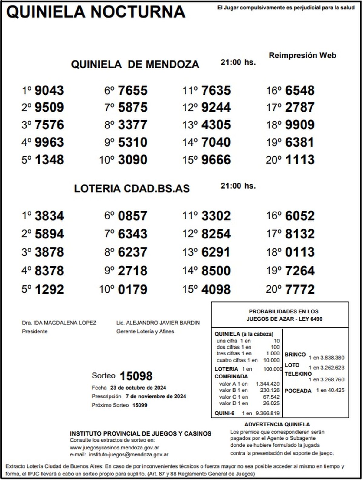 Quiniela de Mendoza: resultados de la Nocturna de hoy, 23 de octubre de 2024