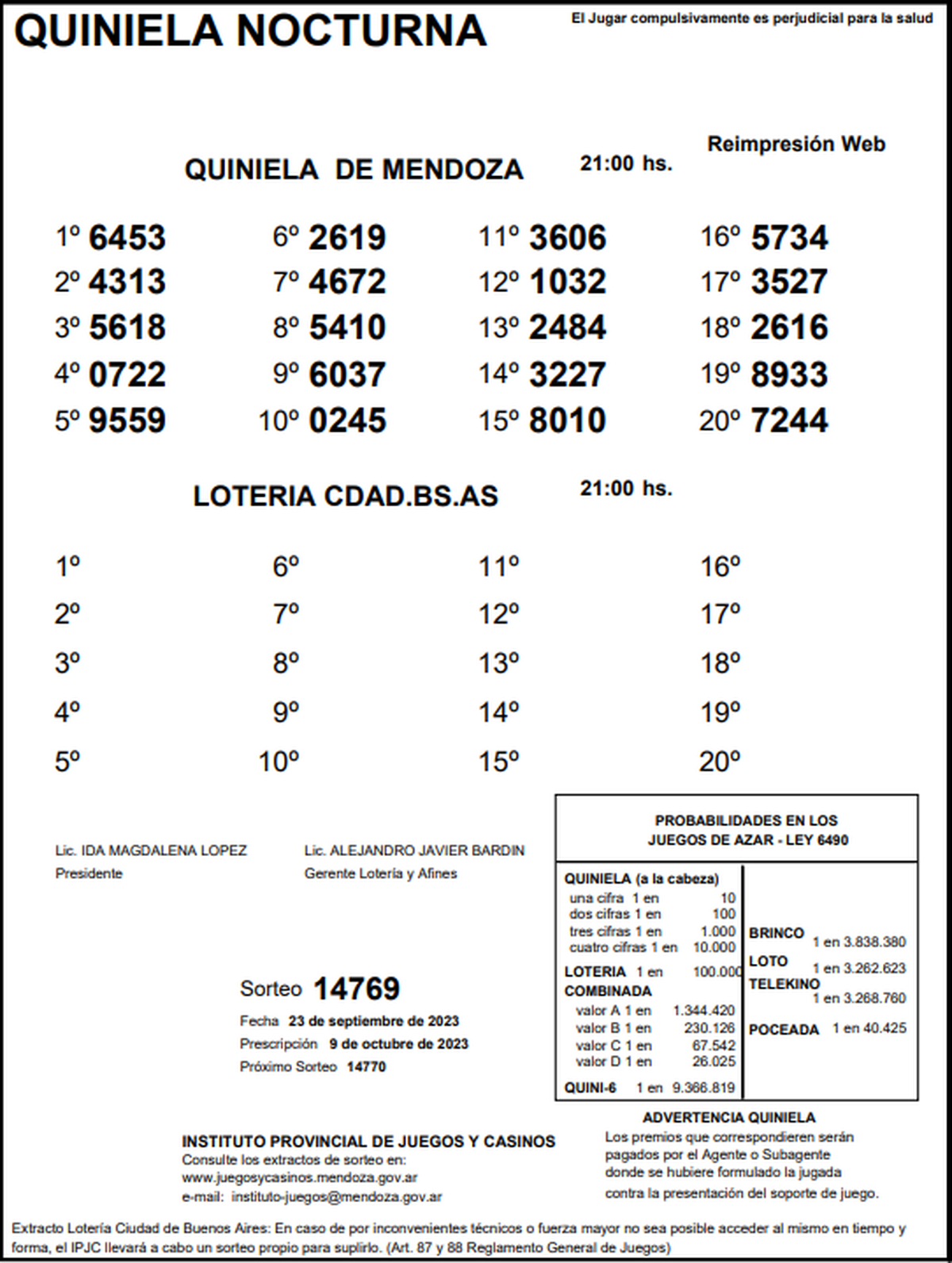 Quiniela de Mendoza: resultados de la Nocturna de hoy, 23 de septiembre de 2023