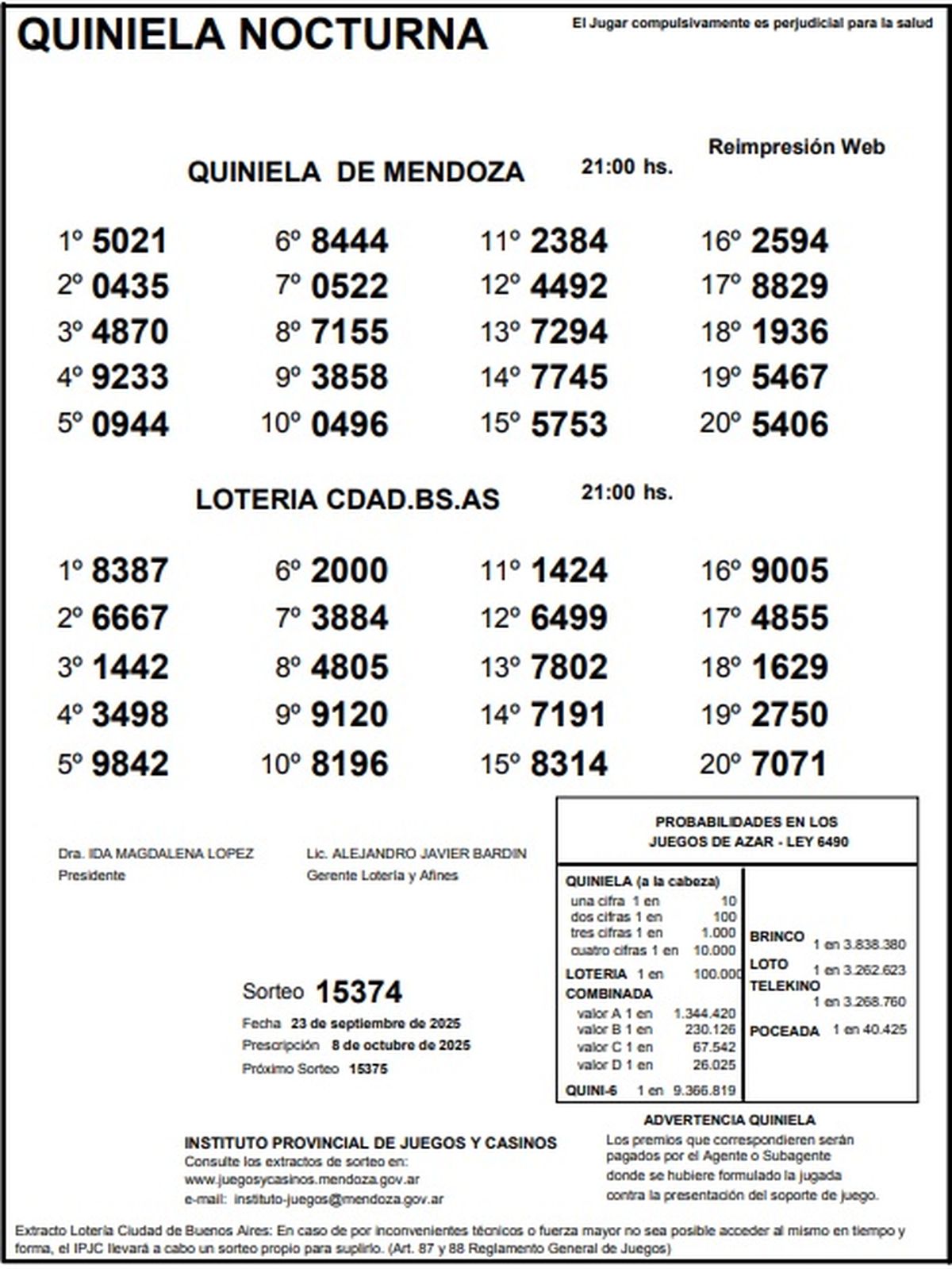 Quiniela de Mendoza: resultados de la Nocturna de hoy, 23 de septiembre de 2025