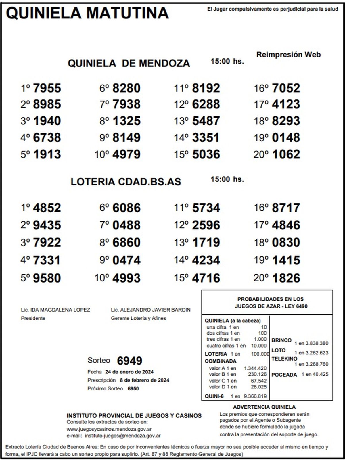 Resultados Quiniela de Mendoza: La Matutina del 24 de enero 2024