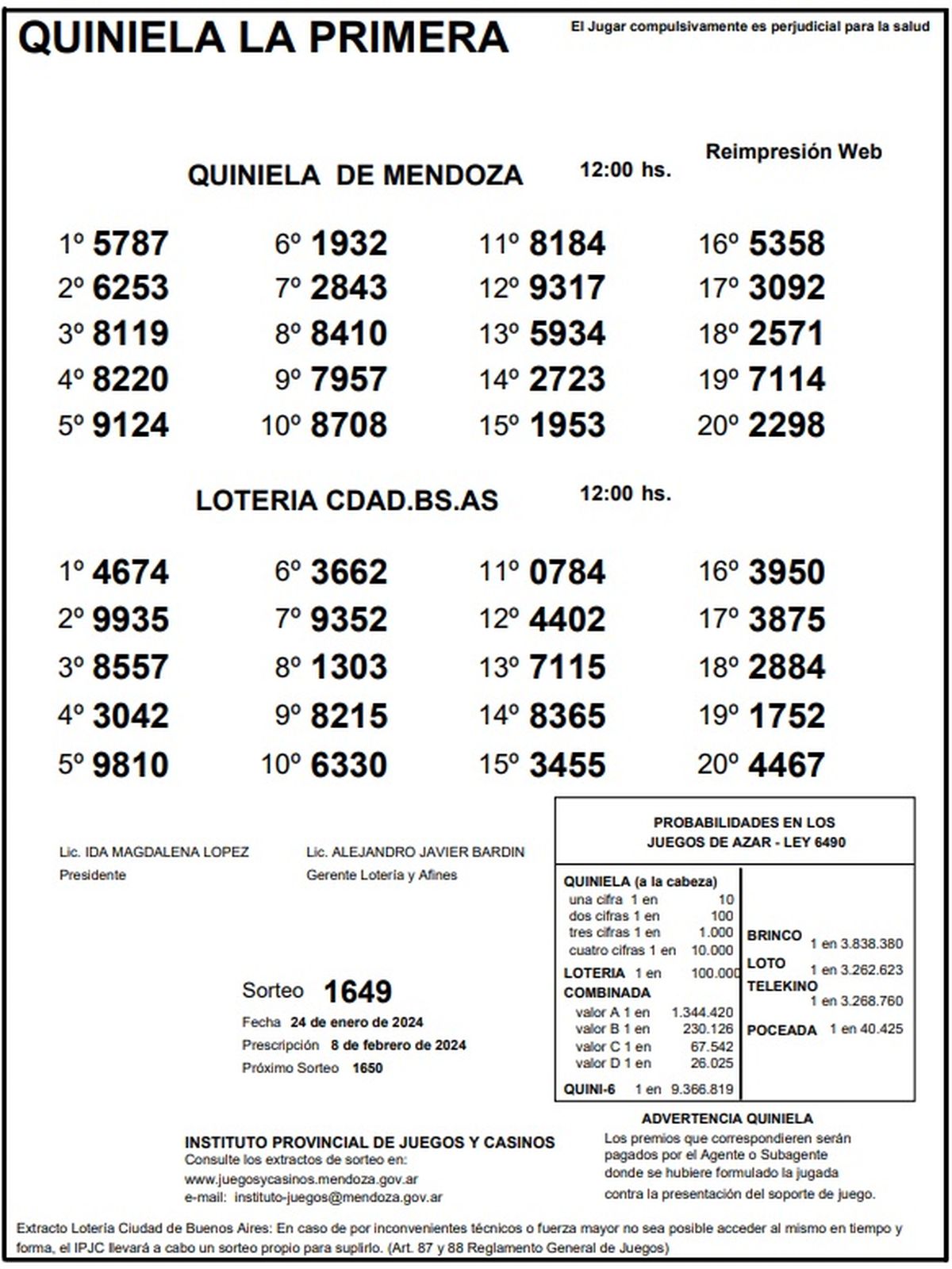Resultados Quiniela de Mendoza: La Primera del 24 de enero 2024