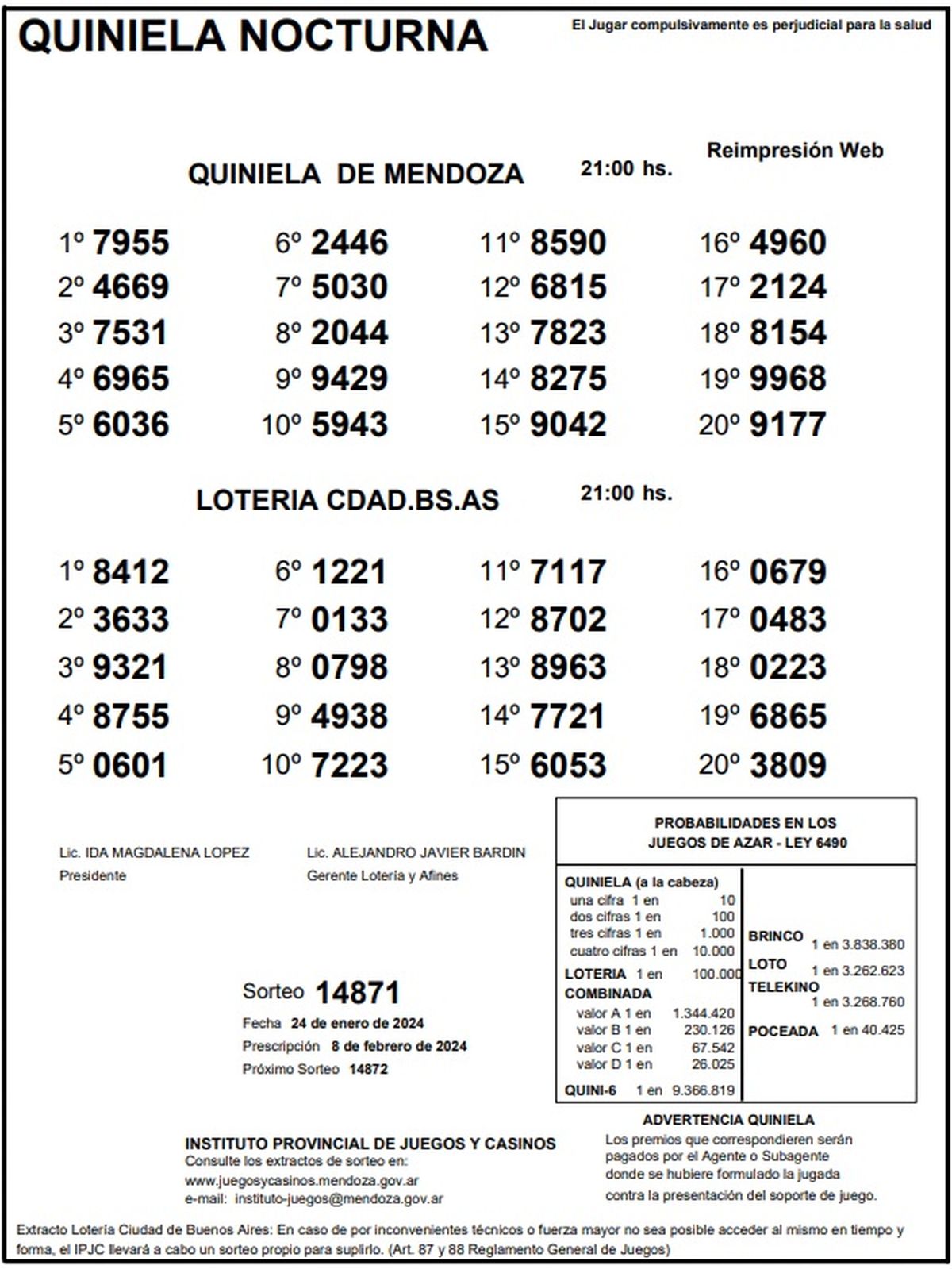 Quiniela de Mendoza: resultados de la Nocturna de hoy, 24 de enero de 2024