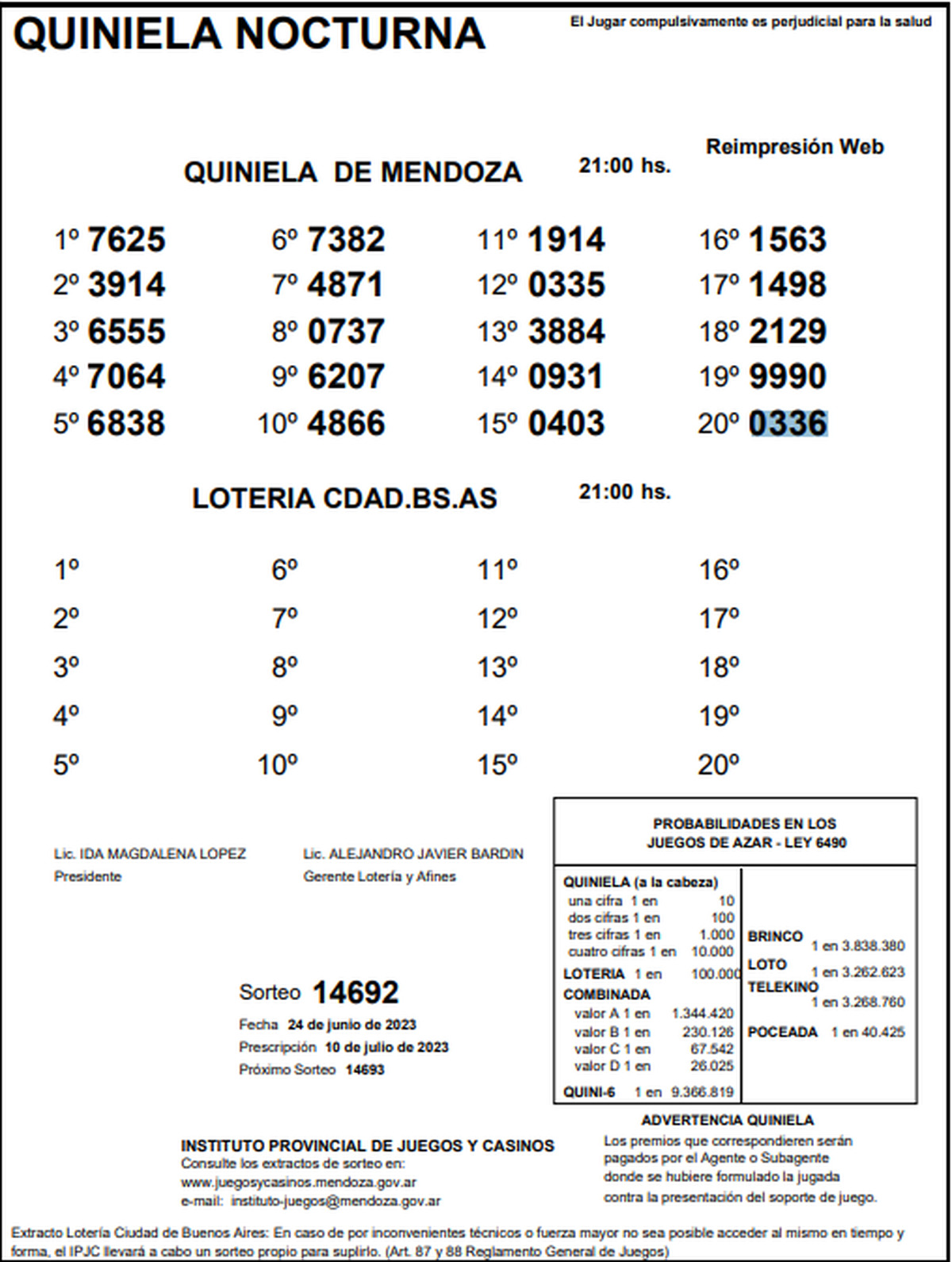 Quiniela de Mendoza: resultados de la Nocturna de hoy, 24 de junio de 2023