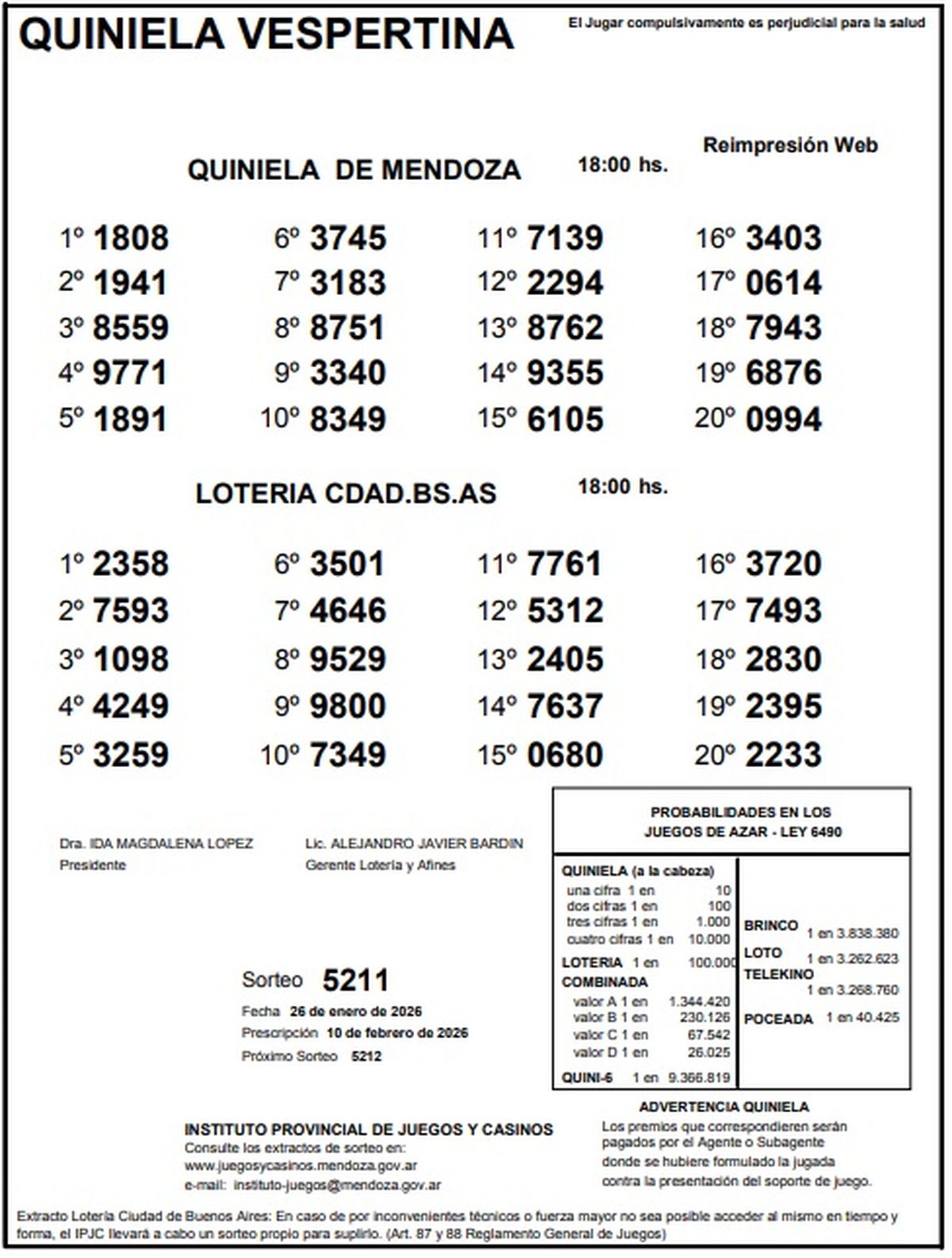 Resultados Quiniela de Mendoza: La Vespertina del 26 de enero de 2026