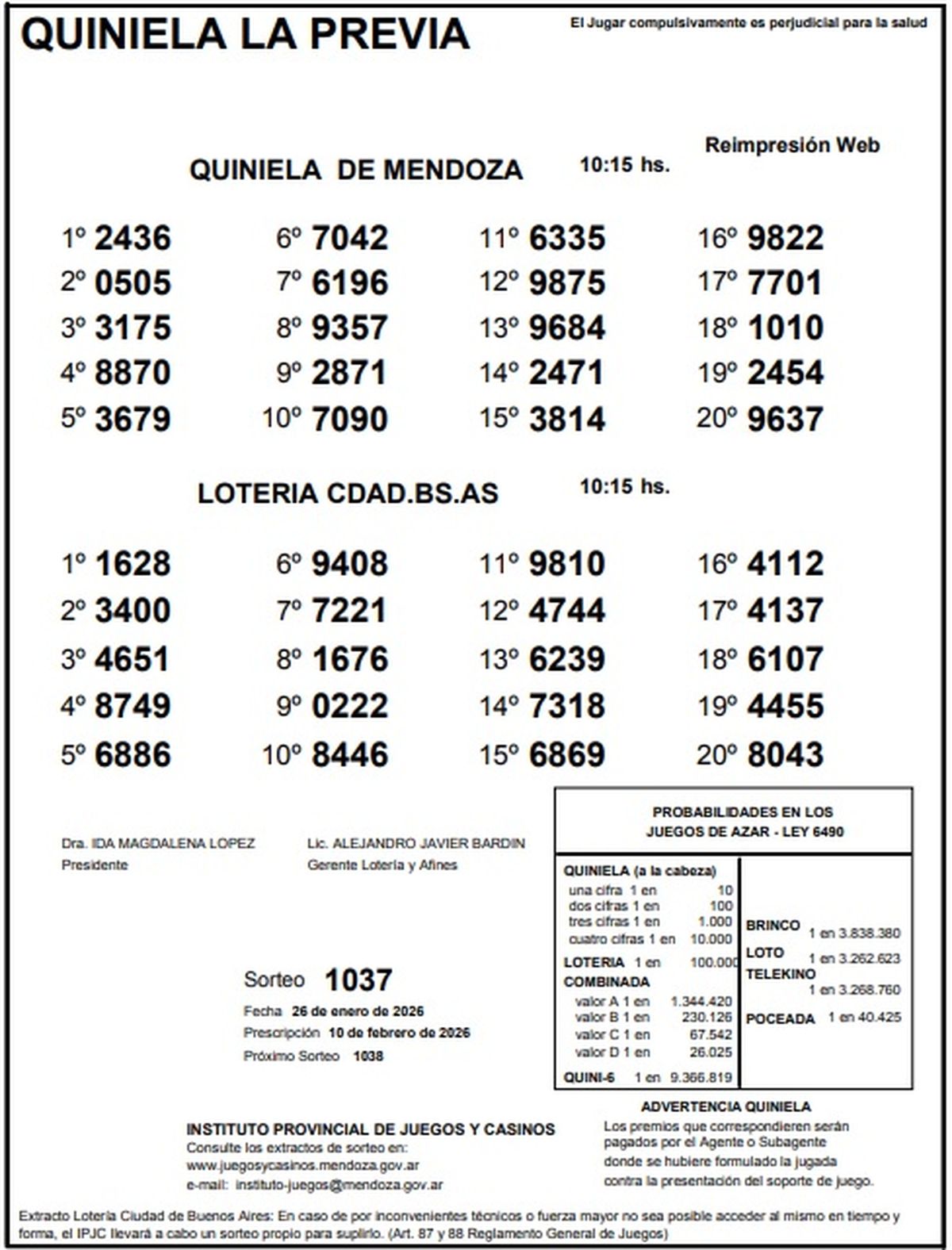 Resultados Quiniela de Mendoza: La Previa del 26 de enero de 2026