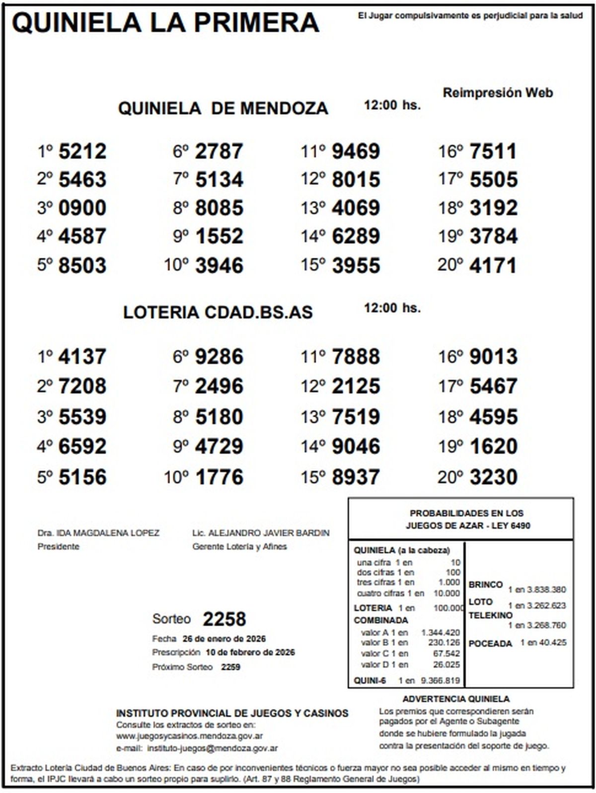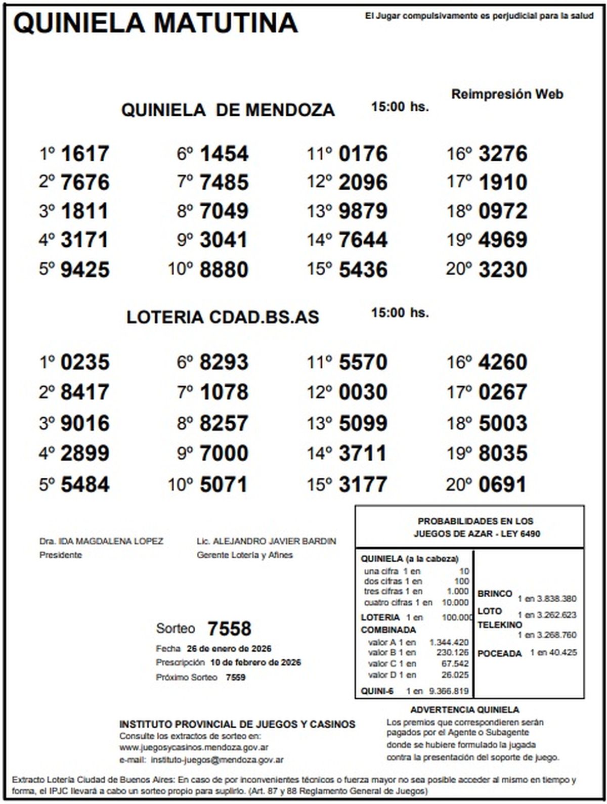 Resultados Quiniela de Mendoza: La Matutina del 26 de enero de 2026