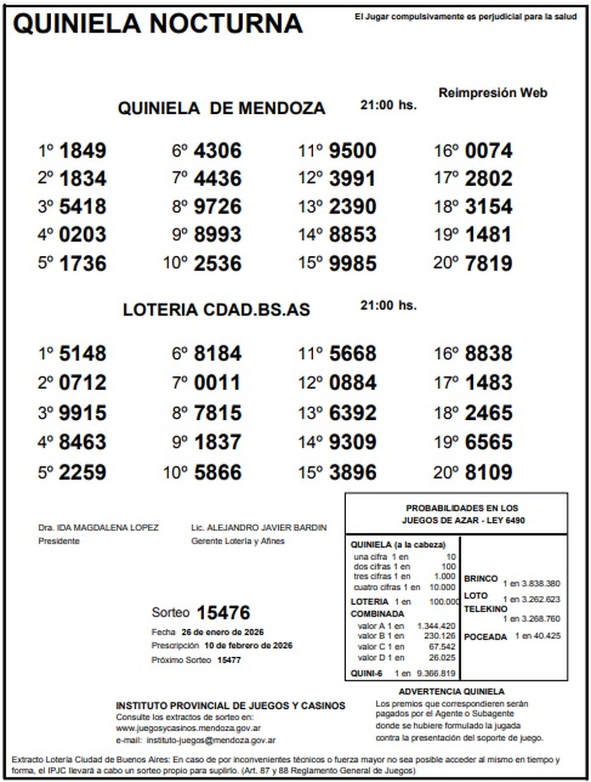 Quiniela de Mendoza: resultados de la Nocturna de hoy, 26 de enero de 2026