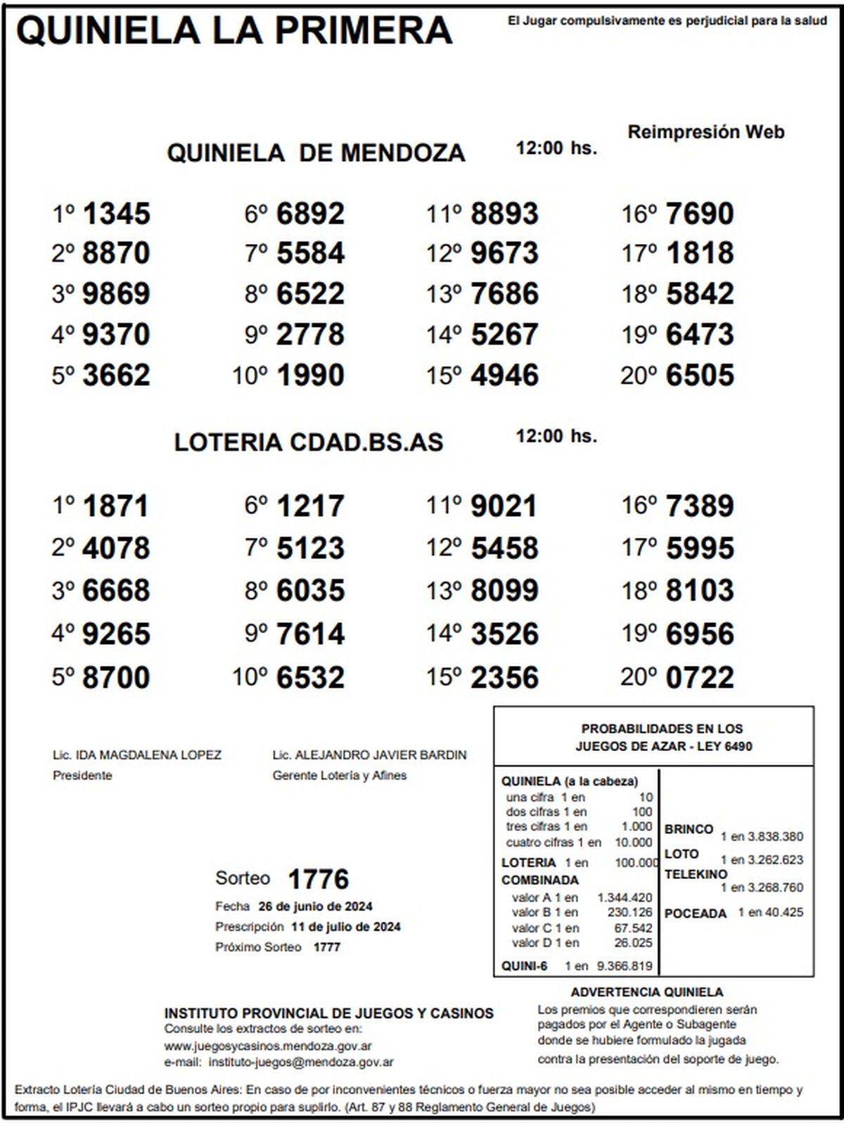Resultados Quiniela de Mendoza: La Primera del 26 de junio 2024