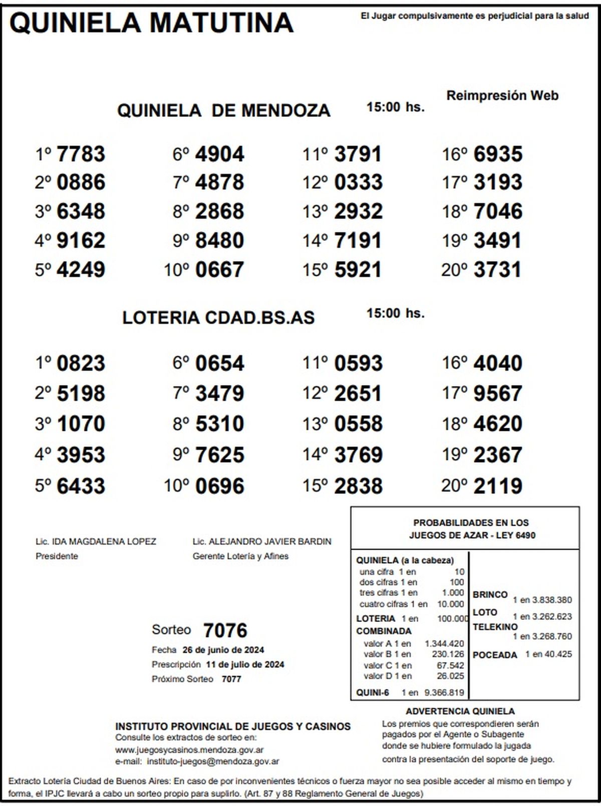 Resultados Quiniela de Mendoza: La Matutina del 26 de junio 202