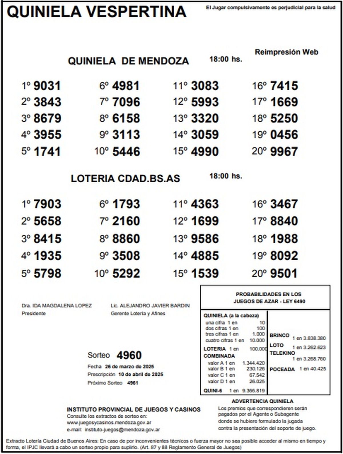Resultados Quiniela de Mendoza: La Vespertina del 26 de marzo de 2025