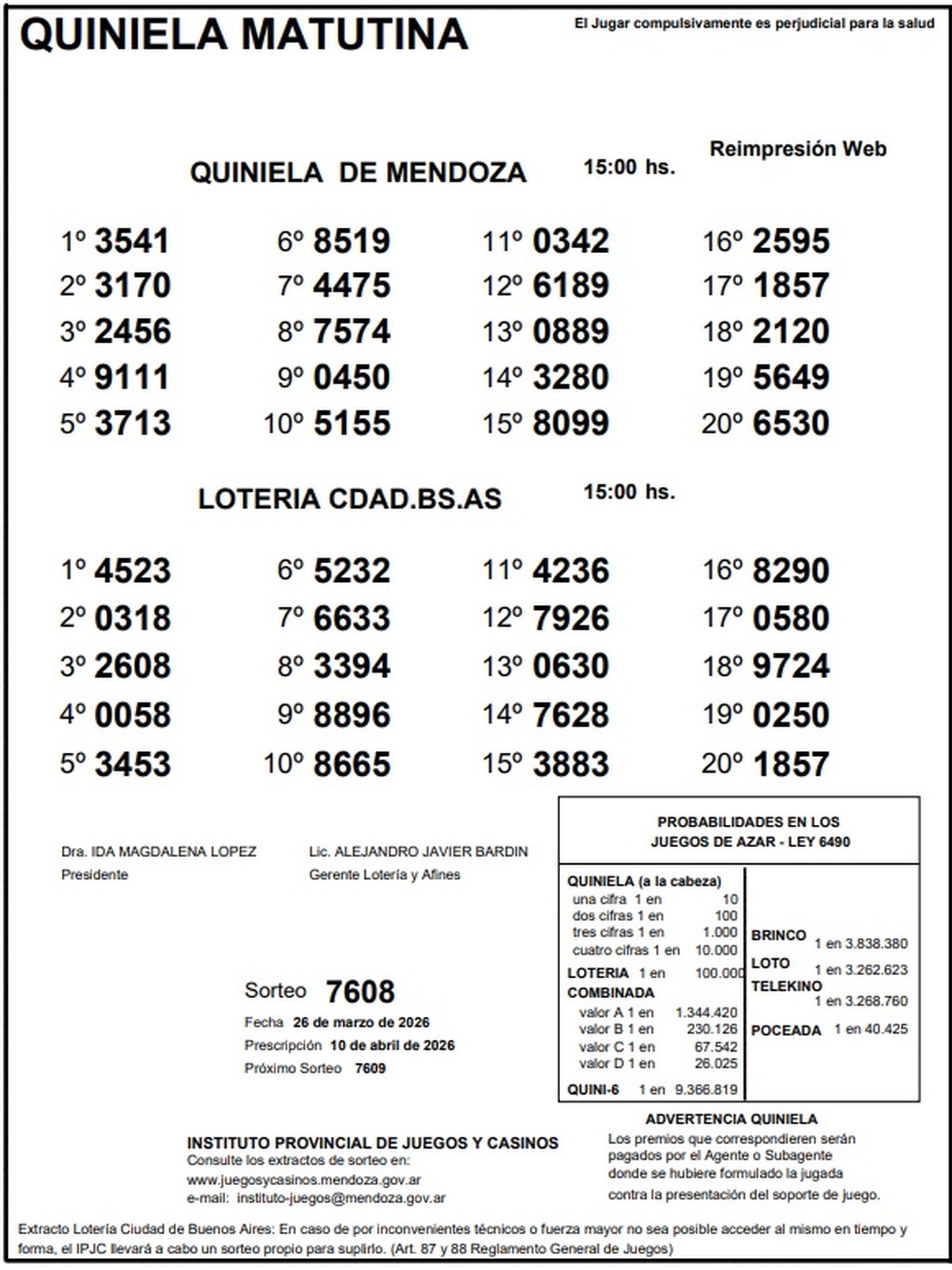 Resultados Quiniela de Mendoza: La Matutina del 26 de marzo de 2026