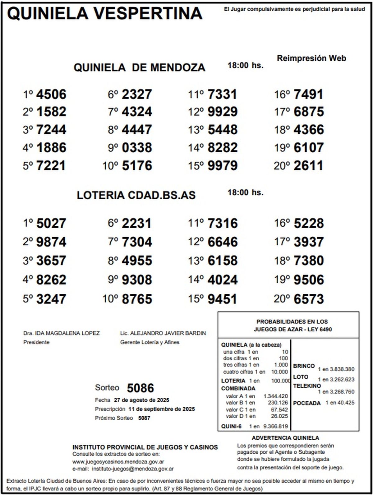 Resultados Quiniela de Mendoza: La Vespertina del 27 de agosto de 2025
