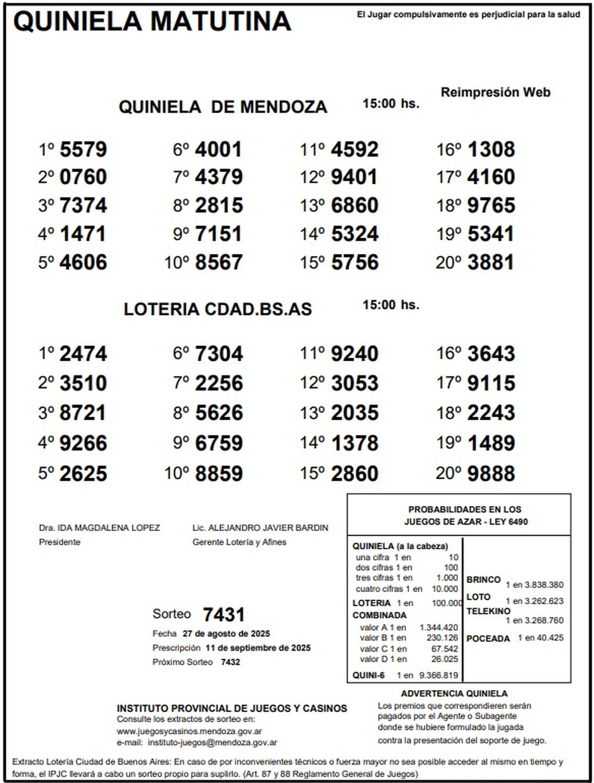 Resultados Quiniela de Mendoza: La Matutina del 27 de agosto de 2025