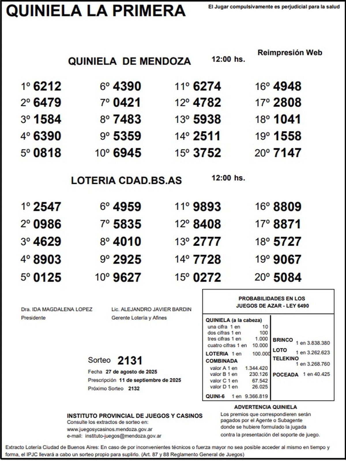 Resultados Quiniela de Mendoza: La Primera del 27 de agosto de 2025