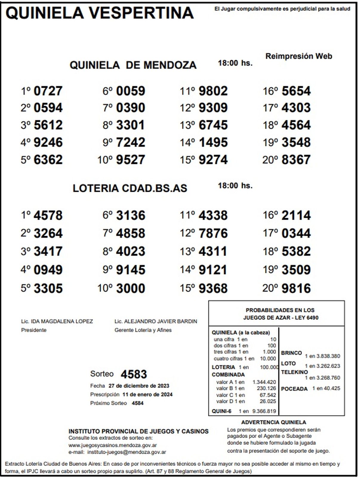 Resultados Quiniela de Mendoza: La Vespertina del 27 de diciembre 2023