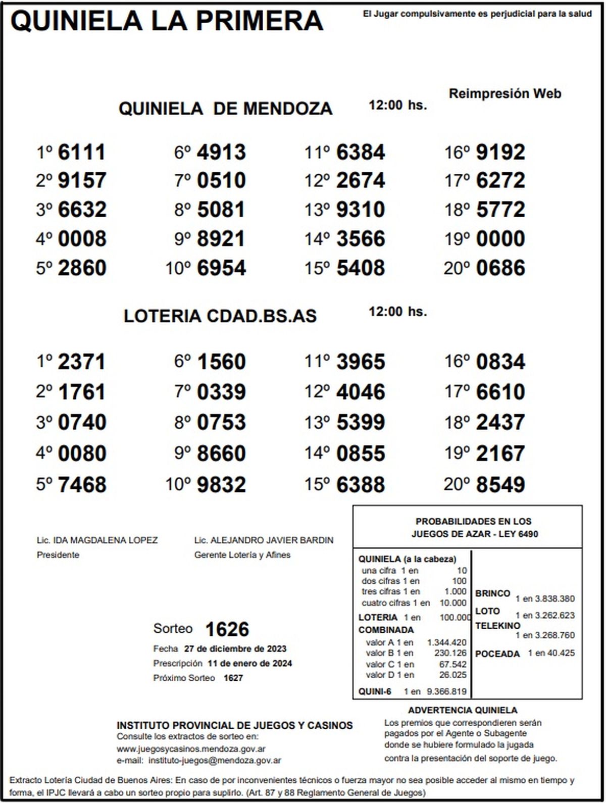 Resultados Quiniela de Mendoza: La Primera del 27 de diciembre 2023