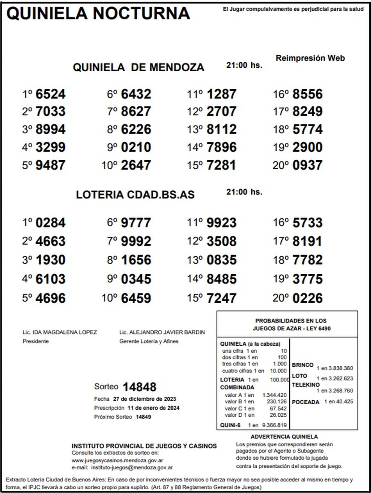 Quiniela de Mendoza: resultados de la Nocturna de hoy, 27 de diciembre de 2023