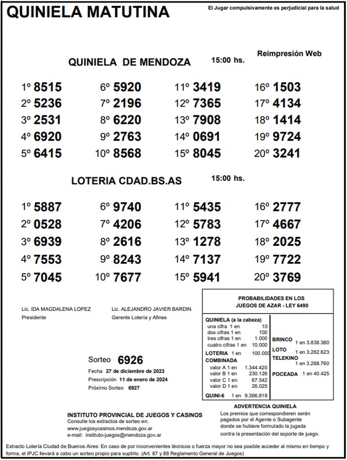 Resultados Quiniela de Mendoza: La Matutina del 27 de diciembre 2023