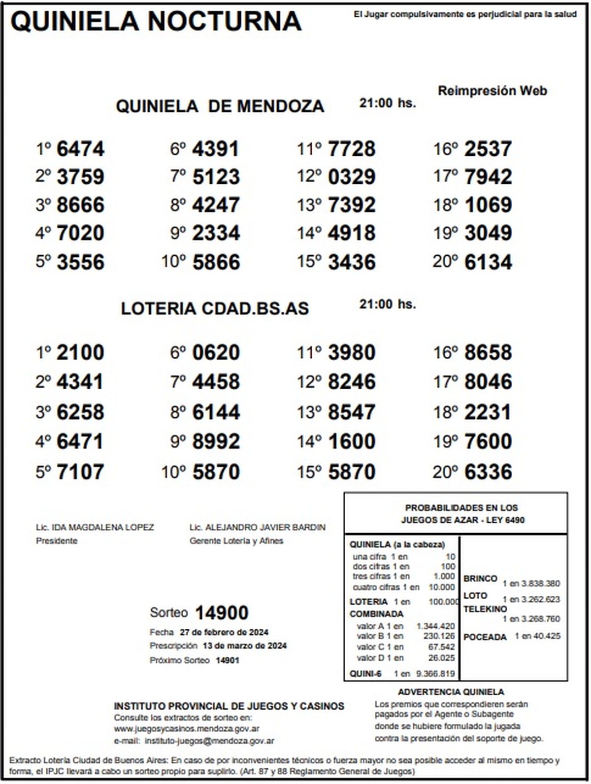 Este martes 27 de febrero se realizó el sorteo número 14900 de la Quiniela de Mendoza en su edición Nocturna y el número ganador resultó ser el 6474. Mientras que en el segundo lugar salió el 3759 y en el tercer lugar el 8666.