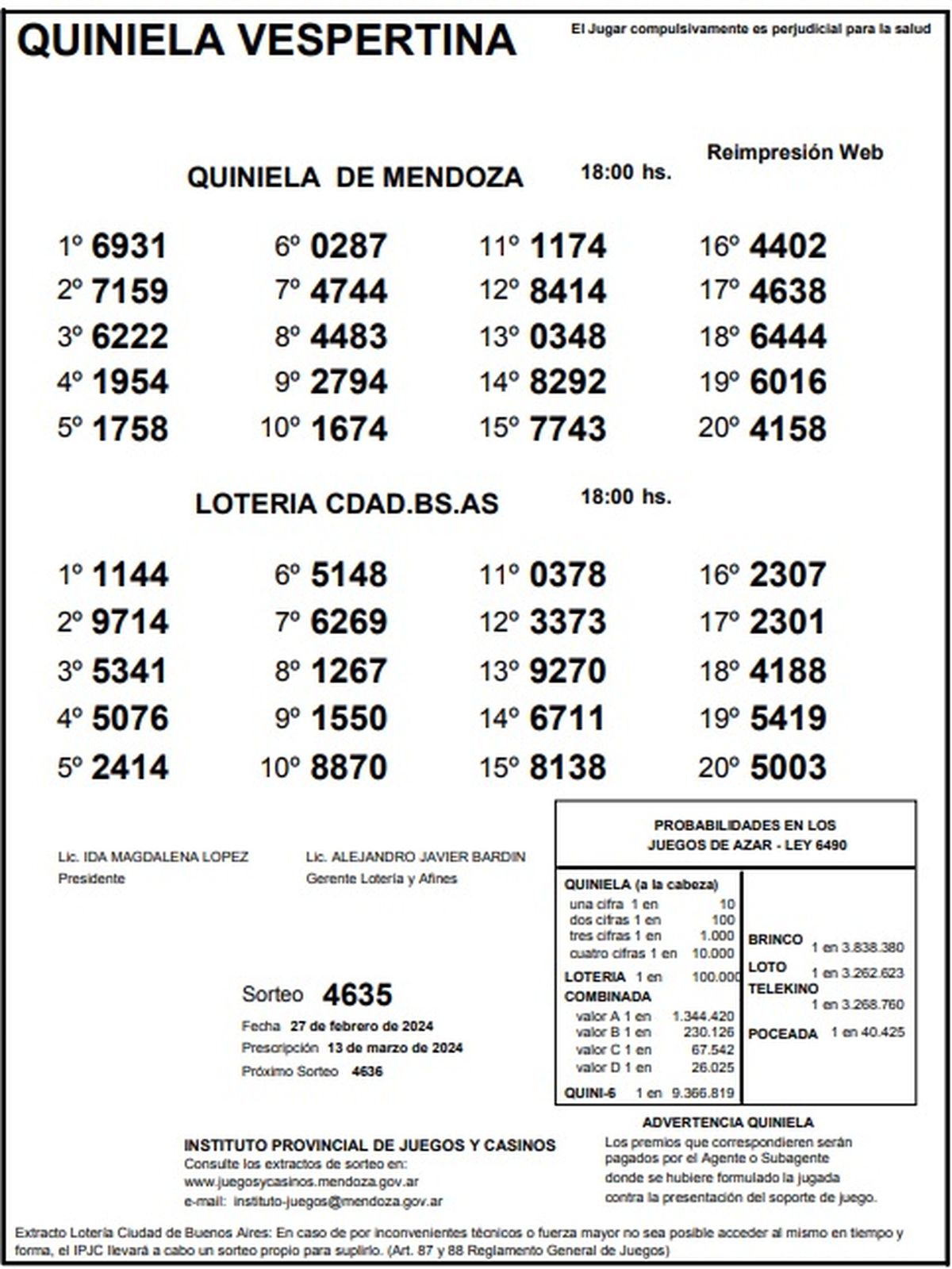 Resultados Quiniela de Mendoza: La Vespertina del 27 de febrero 2024