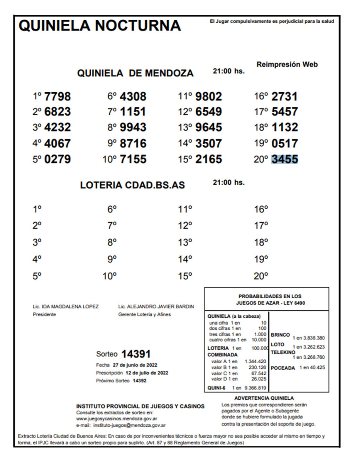Quiniela de Mendoza: resultados de la Nocturna de hoy, 27 de junio de 2022