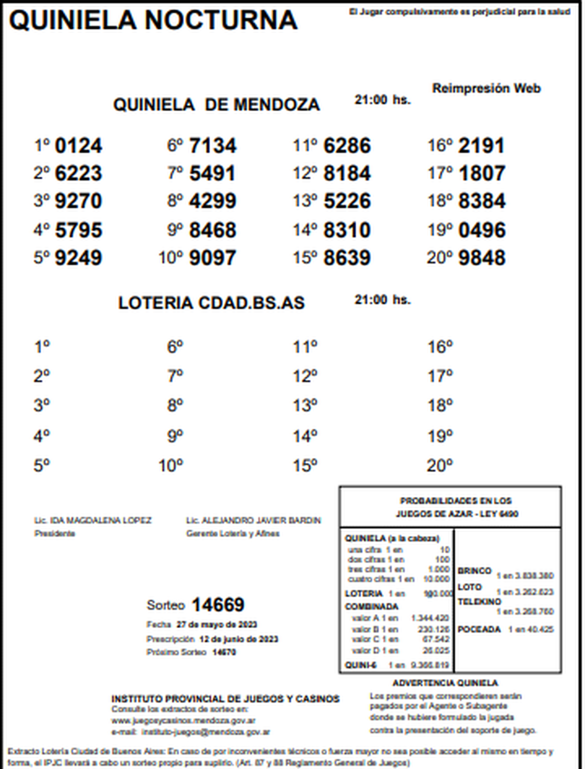 Resultados de la Quiniela de Mendoza en su edición Nocturna.