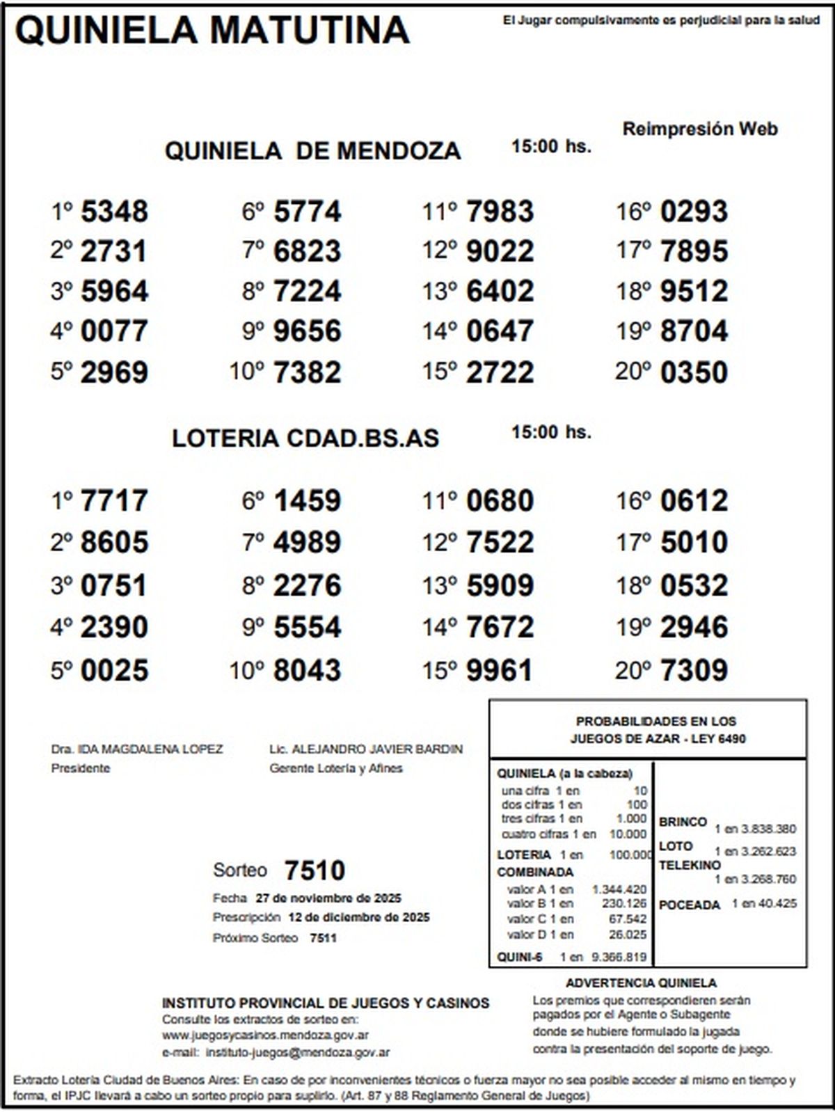 Resultados Quiniela de Mendoza: La Matutina del 27 de noviembre de 2025