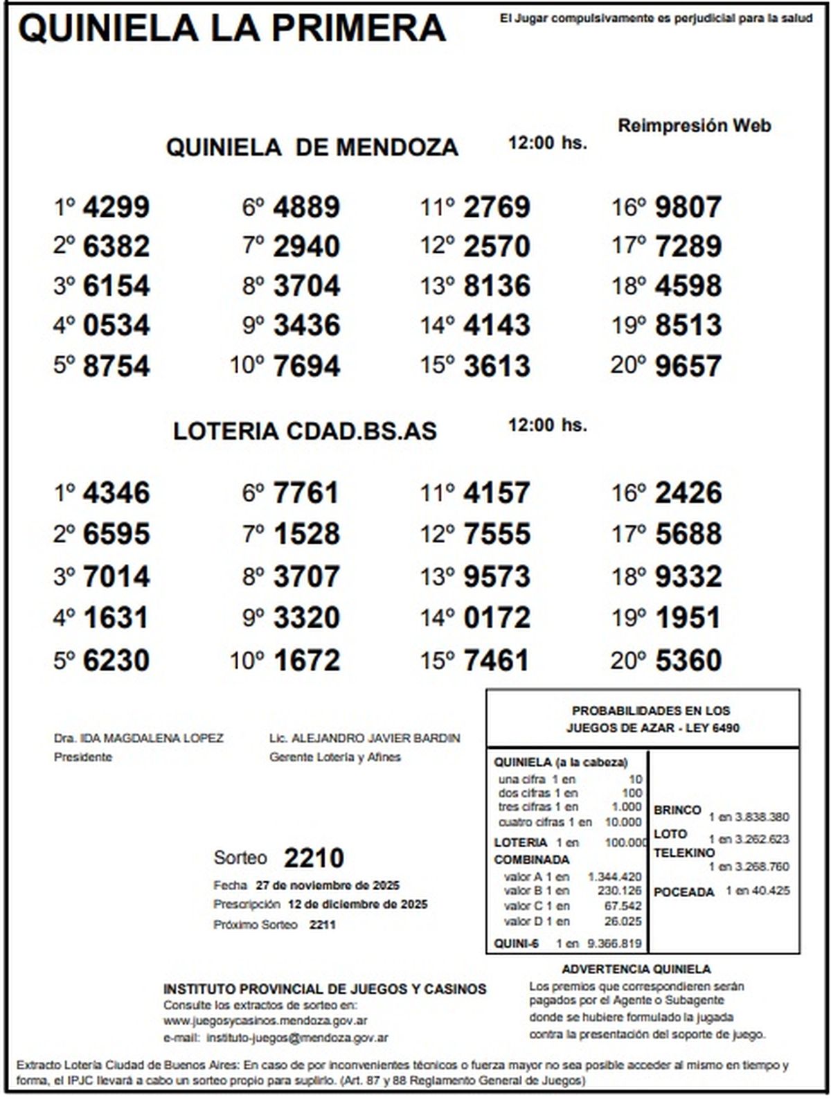 Resultados Quiniela de Mendoza: La Primera del 27 de noviembre de 2025