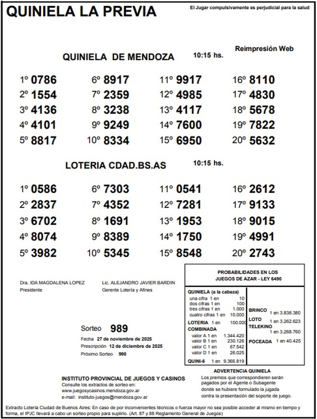 Resultados Quiniela de Mendoza: La Previa del 27 de noviembre de 2025