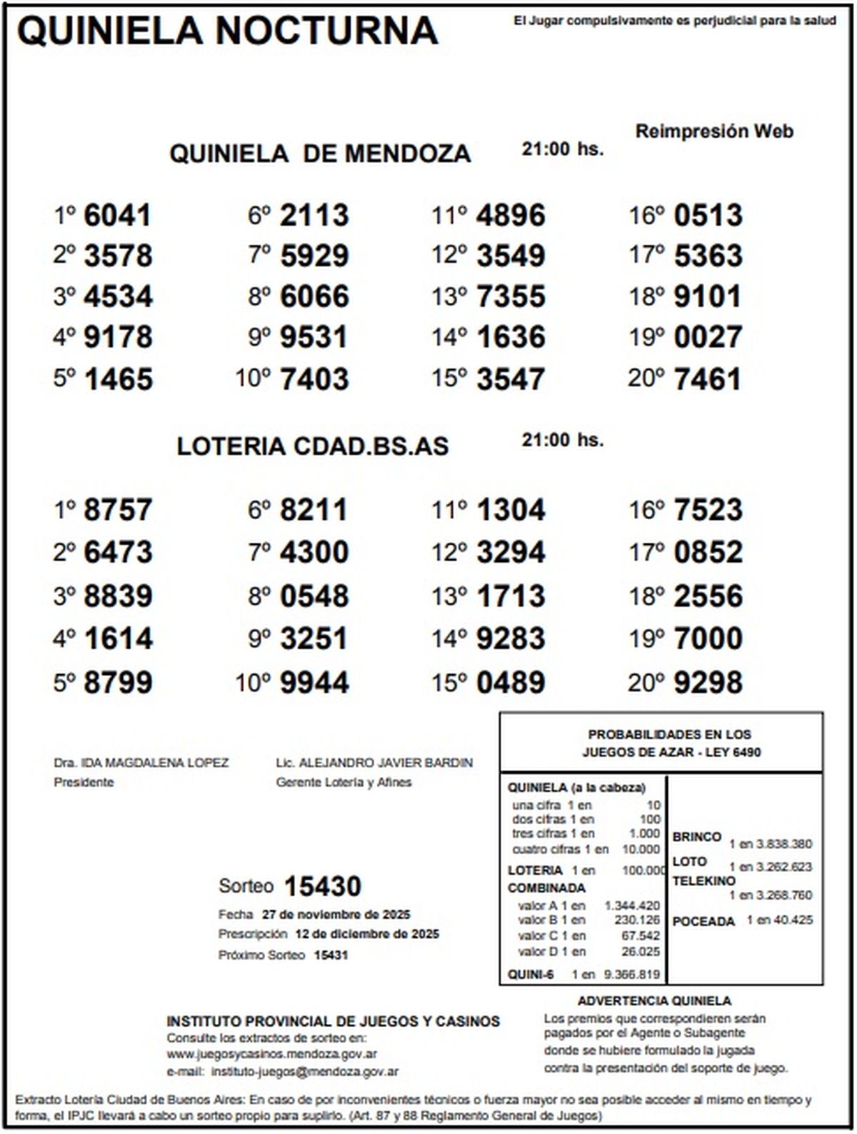 Quiniela de Mendoza: resultados de la Nocturna de hoy, 27 de noviembre de 2025