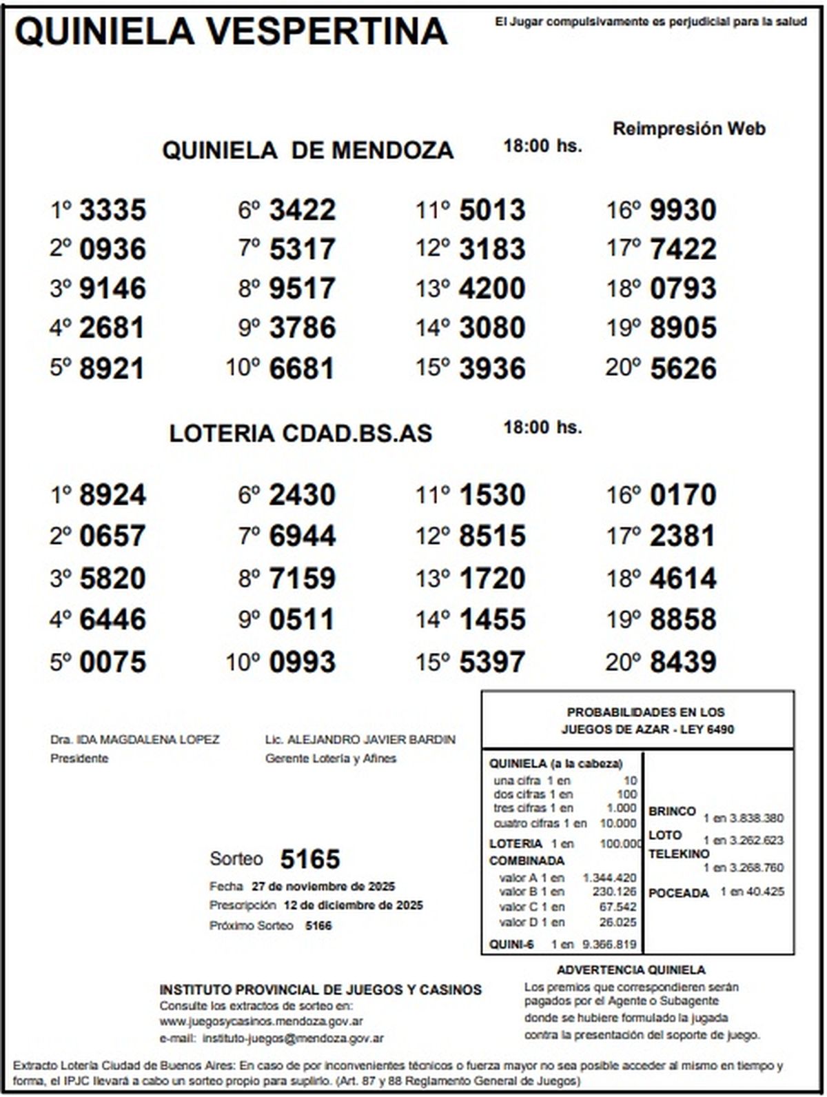 Resultados Quiniela de Mendoza: La Vespertina del 27 de noviembre de 2025